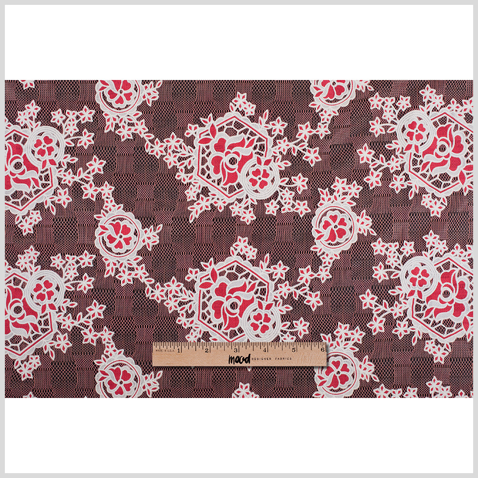 With a row of florals placed within hexagons lining the selvage edges and then further dispersed throughout the center of the fabric, here is a designer lace worth a closer look. Not only does this material come with a complex floral pattern, but if you take a closer look, its mesh backing also holds a geometric pattern of assorted squares with varying densities. Whether transformed into the top layer of dresses, jackets or bottoms, this material will do anything but bore its immediate audience.
