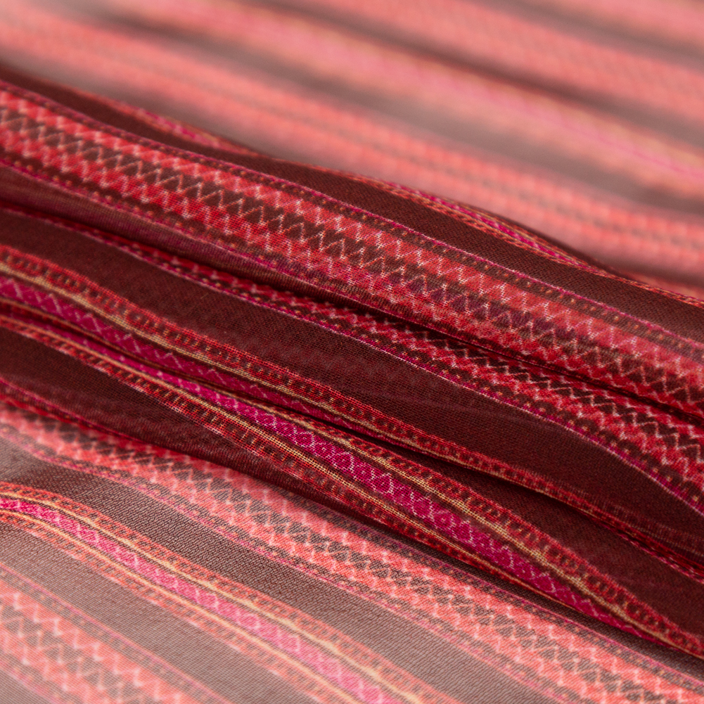 Catch a breeze in the heat with this Famous NYC Designer Red and Pink Striped Silk Chiffon. Imagine the warmth of the sun beating down while a gust of wind sends billowing waves through your featherweight caftan, rippling in tides of patterned pink and red stripes, reminiscent of zig-zag stitching and mini decorative beads. A dry hand presents a crisp hand that falls fluidly into draped silhouettes. This lightweight beauty is ideal for up-scale bikini cover-ups from dresses to sarongs, so slip this on before or after a sweltering day by the pool. Sheer, a lining will help provide full coverage.