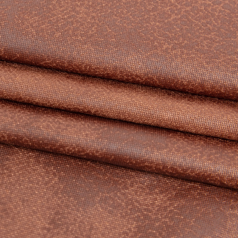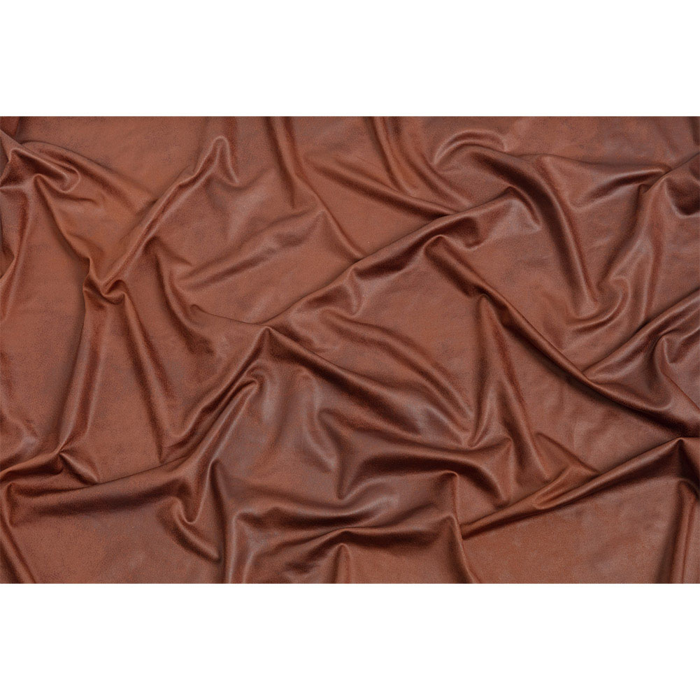 This Vanessa Warm Brown Cloud Textured All Over Faux Leather Foil Stretch Polyester Knit is evocative of a quiet study lined with bookshelves; worldly and classic. Layered over a brown polyester knit, the sleek face, which is lustrous in the light, displays subtle matte areas that create the warm, distressed character sought after in leather. The cloud-soft hand, fluid drape, and 40% weftwise stretch invites comfort into your sewing projects as you create classy dresses, sultry form-fitting tops, and more. Please note that this fabric lets some light through and may appear slightly translucent when stretched.