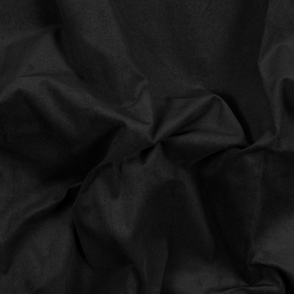 Laidback, but always chic, check out this Black Featherwale Cotton Corduroy. Made of 100% combed cotton, it boasts a soft, lightly fuzzy hand upon its classic ribbed design. For those unfamiliar with the term "featherwale", it refers to the thinness of the cords. This particular collection holds 21 wales per inch. Thin and lightweight, it has a stiffer drape that lends itself to tailored designs. We see retro buttoned shirts, cuffed shorts and simple dresses. Translucent, insert a lining for more opacity.