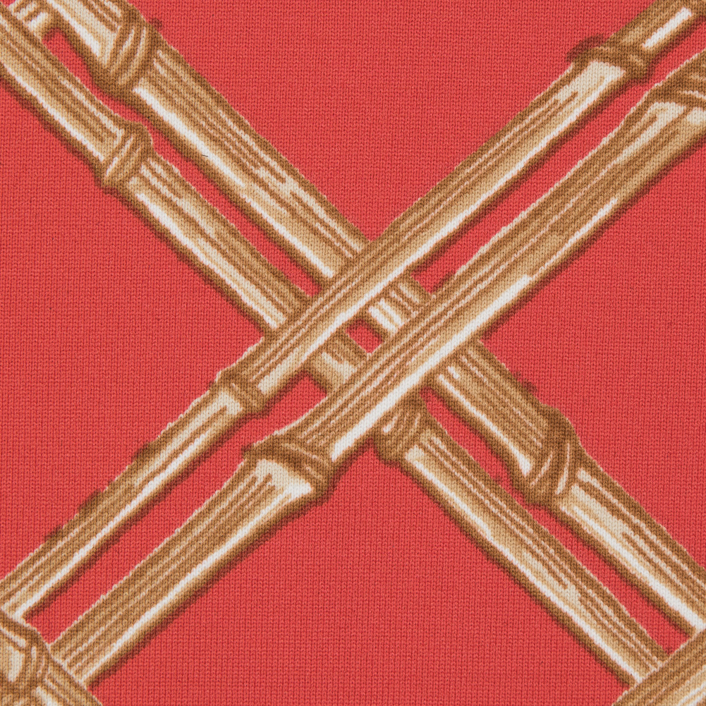 Dreaming of bamboo cabanas with an oceanside view? This Fiesta Orange and Taffy Bamboo Printed Polyester Jersey will take you there! Of a medium weight and breathable, this fabric is ready for warmer weather. Its 4-way stretch along with its easy drape can create fun peplums, wrap dresses and tunics. Soft in hand, feel comfortable all day. Although this fabric is opaque, when it is stretched it becomes slightly sheer.