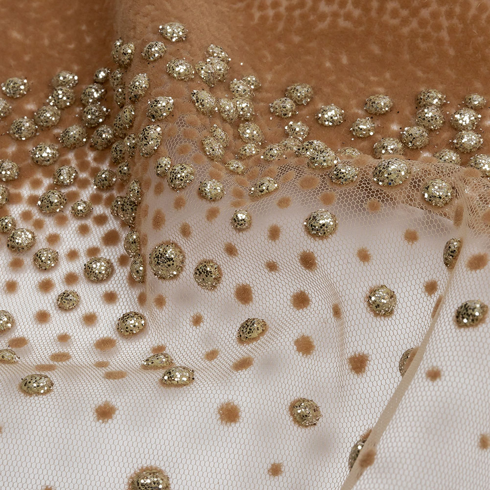 Make something with perfect taste thanks to this Caramel Abstract Stripes Flocked Puffy Glitter Tulle. Featuring a slight mechanical give, tactile hand, and voluminous drape.Suggested Projects: Gowns, Skirts, CostumesContent: 100% PolyesterStretch: Slight Mechanical GiveOpacity: Semi-SheerGolden-brown and enrichingly sweet, a glimmering array of puffy spots and tiny flocked dots are spread across a delicate caramel-colored base. With a somewhat soft, textured hand and voluminous drape, this tulle is ideal for overlays on special occasion outfits such as wedding gowns, graduation dresses, dance costumes, hair accessories, and more! Semi-sheer, a lining might be necessary for opacity.