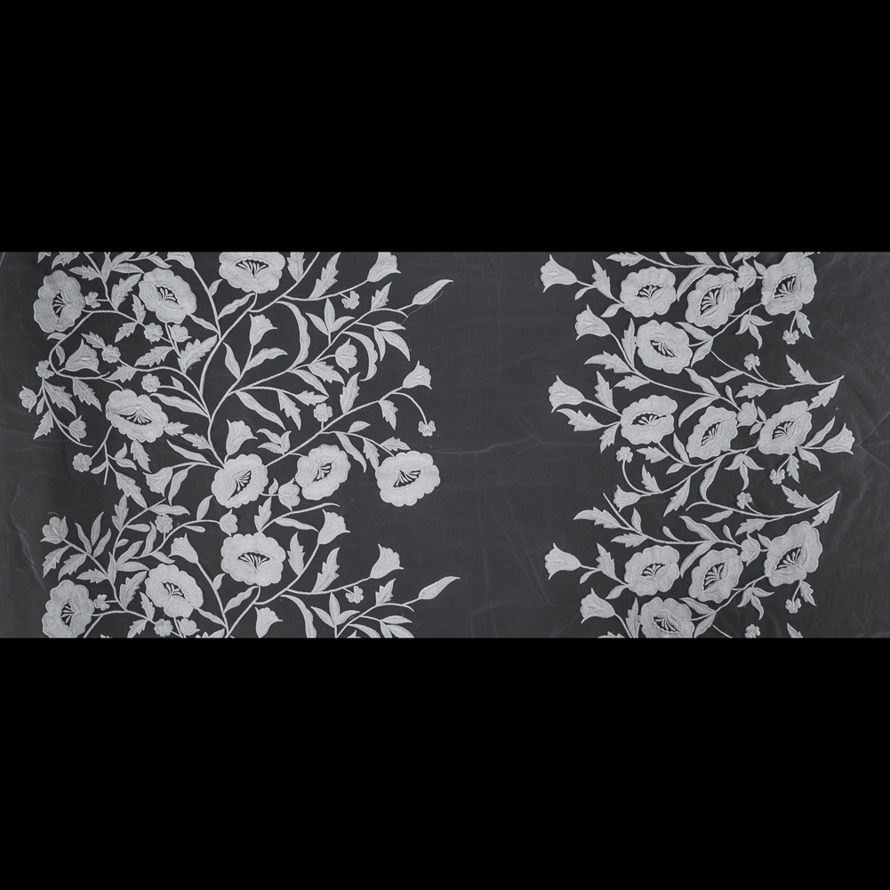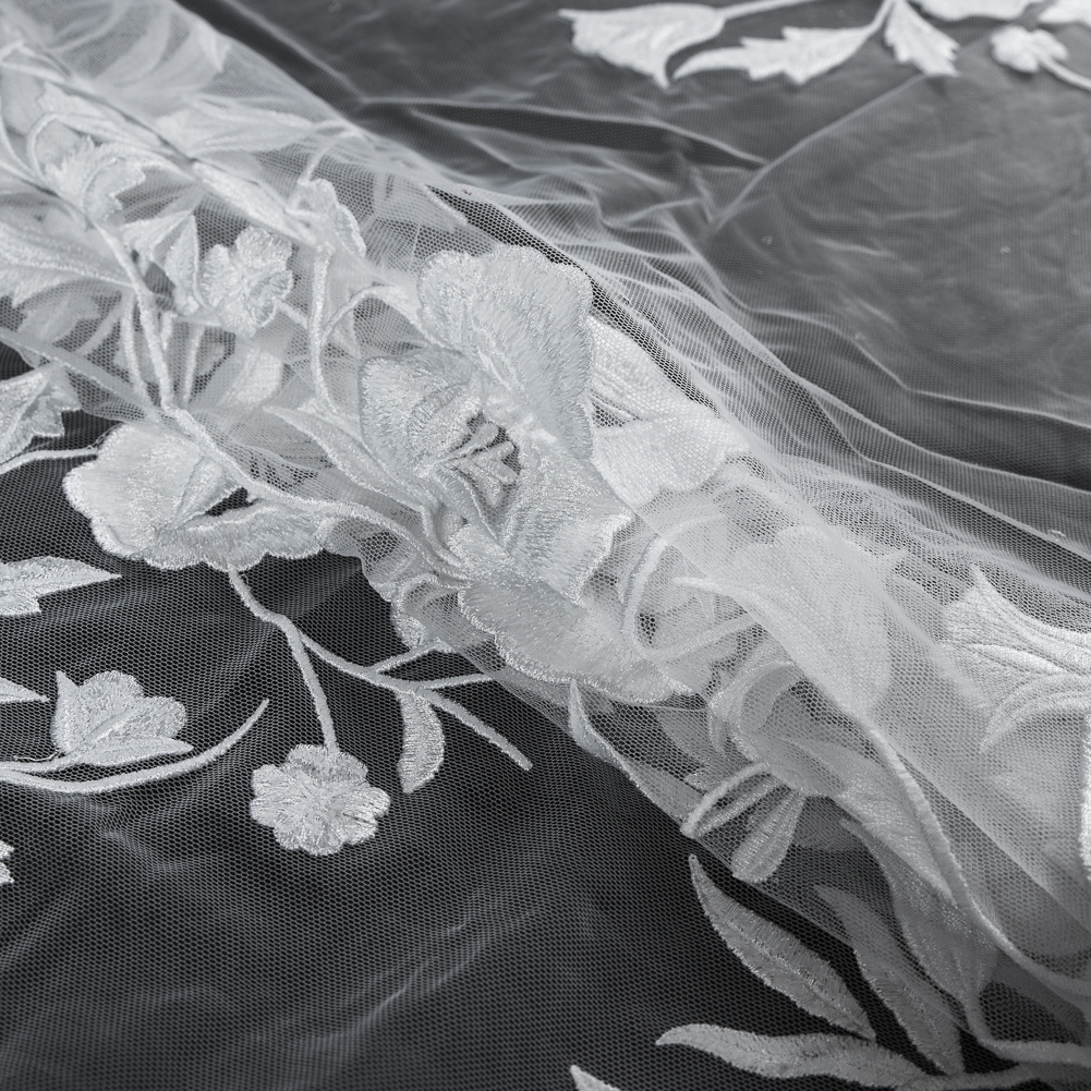 Bursting in bold floral design, don't miss the chance to own this White On White Floral Embroidered Tulle!Suggested Projects: Overlays for Gowns, Skirts, and JacketsContent: 100% PolyesterStretch: Slight WeftwiseOpacity: SheerLarge floral vignettes grow in two columns across a sheer, soft white tulle. Let it flow as its drape moves with ease and grace across the floor. Create stunning looks for a black tie or red carpet event with full-length gowns or voluminous skirts. Equipped with a stretch through its weft, create comfortable pieces that flex and move with you.