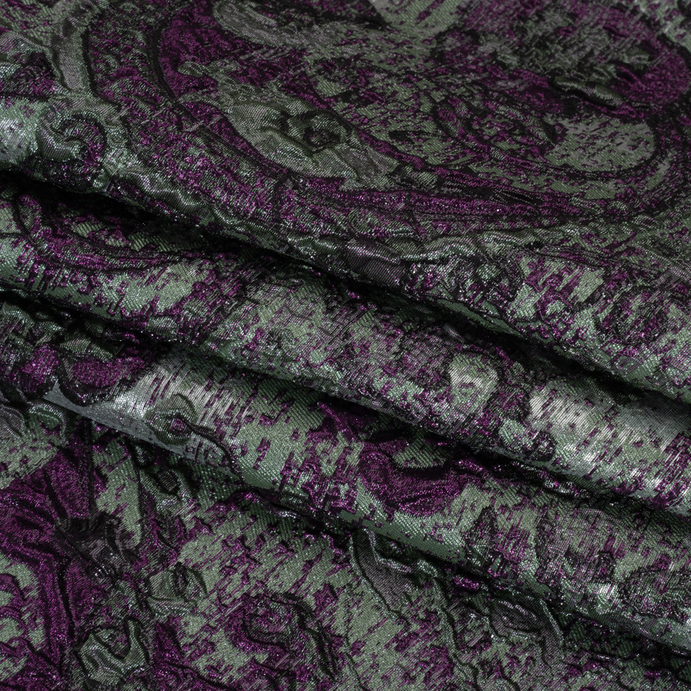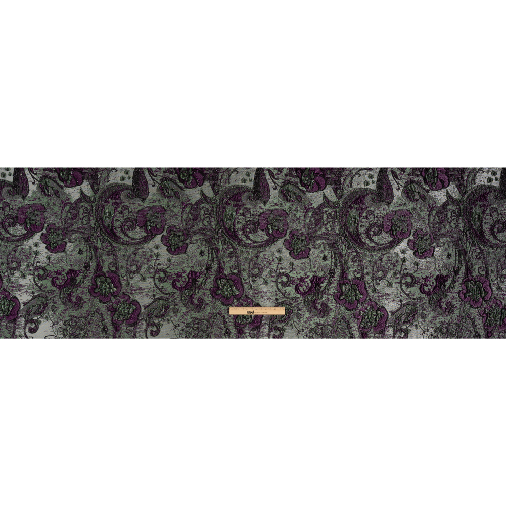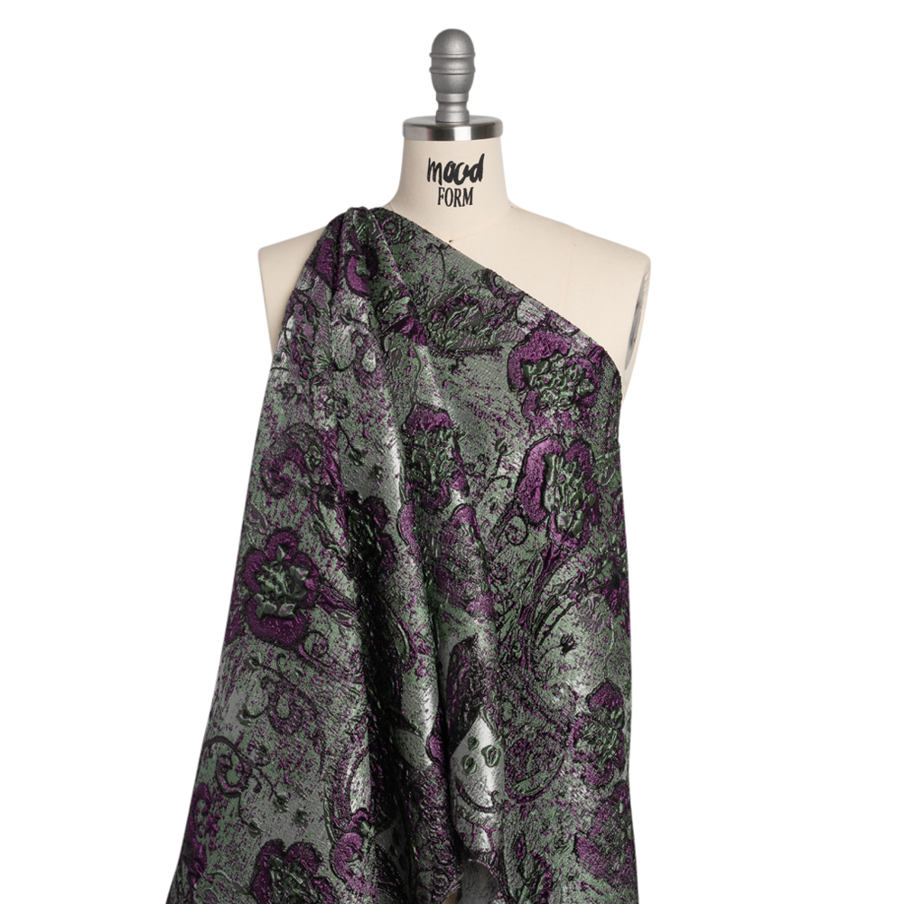 Come one, come all, welcome to the masquerade ball! This Metallic Plum Purple, Sage Green and Gray Flowers and Curls Luxury Brocade features an entirely opaque, embossed face and semi-structured drape, perfect for creating stunning evening wear.Suggested Projects: Skirts, Jackets, DressesContent: 50% Polyester, 30% Viscose, 20% LurexStretch: No StretchOpacity: OpaqueEmbossed metallic plum purple and sage green florals curl against an opaque silver background. Abound with texture and dimension, this brocade turns every occasion into a special occasion—perfect for creating evening gowns, structured jackets, corsets, flowing skirts, and more. With its tactile hand and jewel tones, it’s a pattern for all the senses. Though opaque, we suggest a lining be added for comfort of wear.