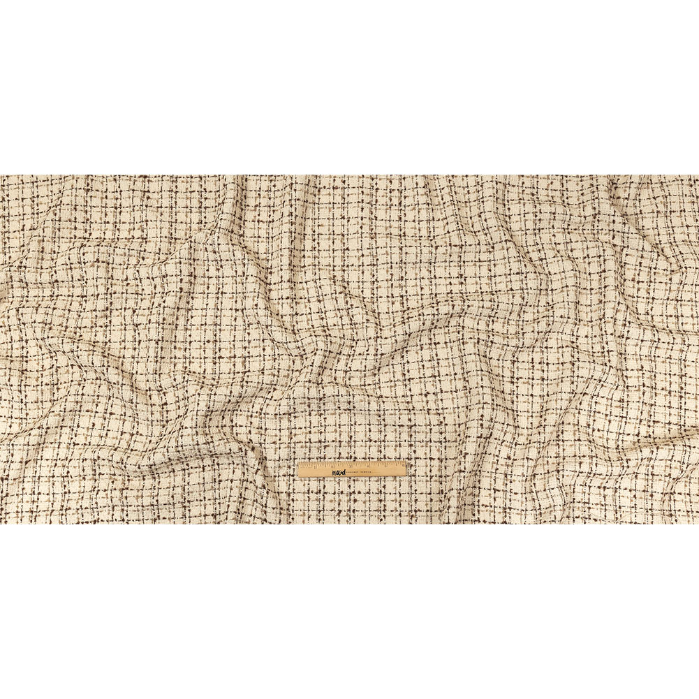 Let the skies clear and show you the way to this pastoral Fog, Amphora and Rocky Road Plaid Tweedy Polyester Boucle! Brown, tan, and off-white fibers criss-cross in a textural, rustic boucle. Pliable and somewhat voluminous in drape, create trench coats, blazers, or structured dresses. Translucent, a lining may be desired for additional structure and modesty on tailored projects.