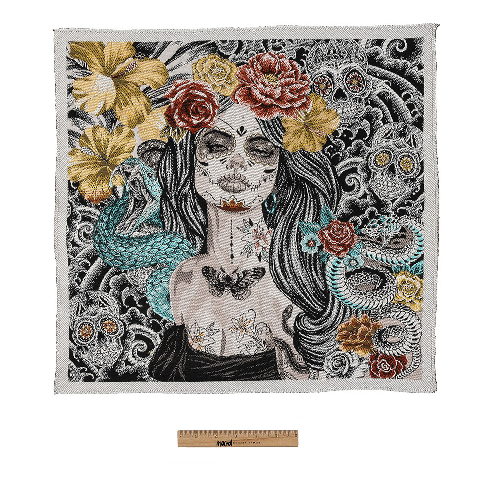 Biker but dreamy, our Noir A Dark Romance Oversized Square Patch is full of really satisfying juxtapositions. Over a surrealist background of black skulls and waves, yellow flowers, and a fiercely protective aquamarine viper, is a dreamy, tattooed brought-to-life sugar skull woman with yellow and red flowers in her hair. Imported from France, you'll find it easy to make a stylish statement using this oversized appliqué. Sew this patch onto denim jackets, throw pillows that will bring your living room to life, totes that carry art books and ‘70s literature, or frame it and add it to an art-dedicated wall.Please note: Due to the unique construction of each patch, the dimensions may vary from piece to piece and are roughly 18⅞" x 18⅞"—which includes between ½"-¾" of a selvage around all four sides. WARNING: Cancer and Reproductive Harm - www.P65Warnings.ca.gov.
