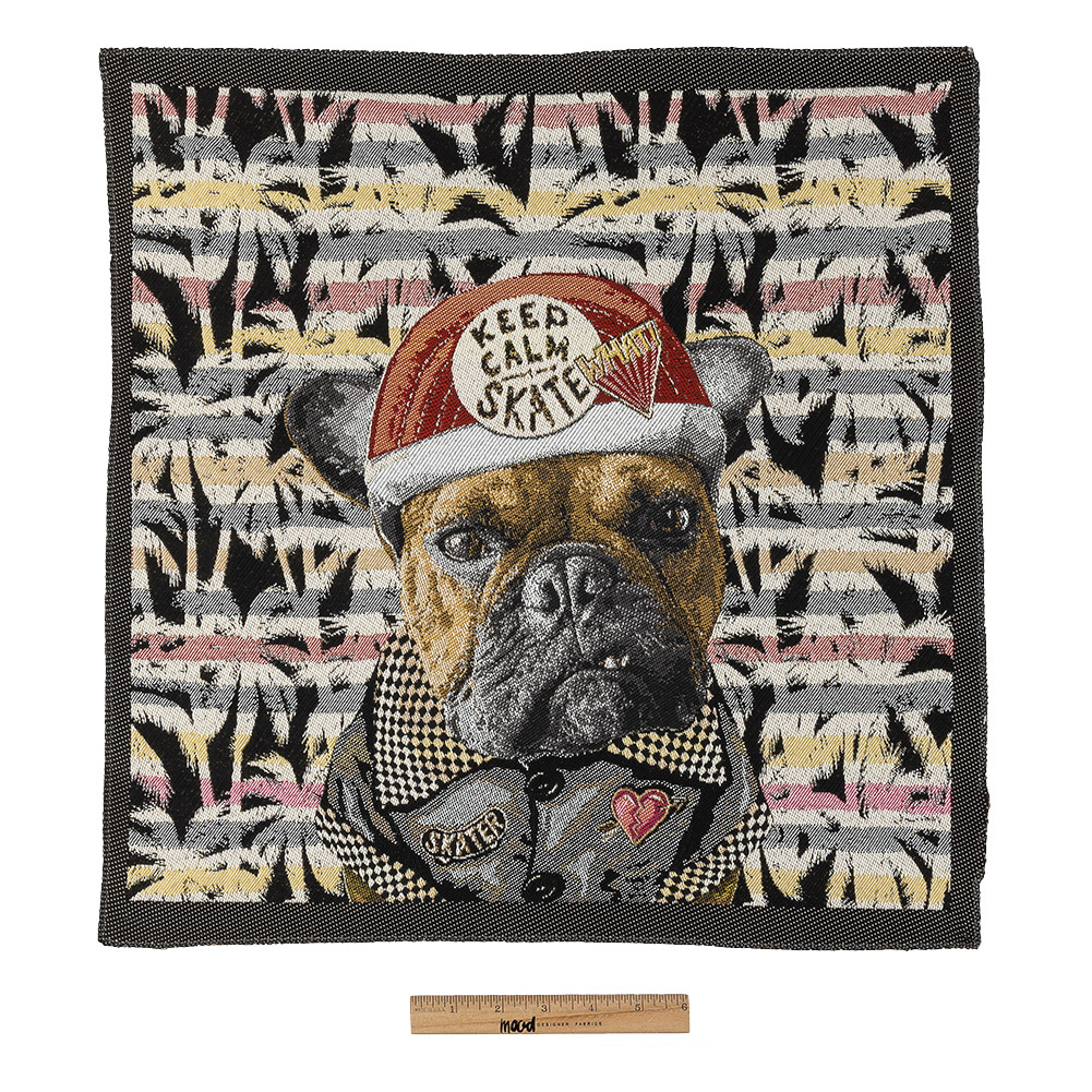 You've never seen a relaxing message with a delivery like our Noir Keep Calm Skater Oversized Square Patch. Over a backdrop of black palm tree silhouettes and pink, yellow, and gray stripes is a tough skater pup wearing a red helmet with stickers and a rebel-style button up with a checkered collar. Imported from France, you'll find it easy to make a stylish statement using this oversized appliqué. Sew this patch onto denim jackets, throw pillows that will bring your living room to life, totes that carry art books and skater novels, or frame it and add it to an art-dedicated wall.Please note: Due to the unique construction of each patch, the dimensions may vary from piece to piece and are roughly 18⅞" x 18⅞"—which includes between ½"-¾" of a selvage around all four sides. WARNING: Cancer and Reproductive Harm - www.P65Warnings.ca.gov.