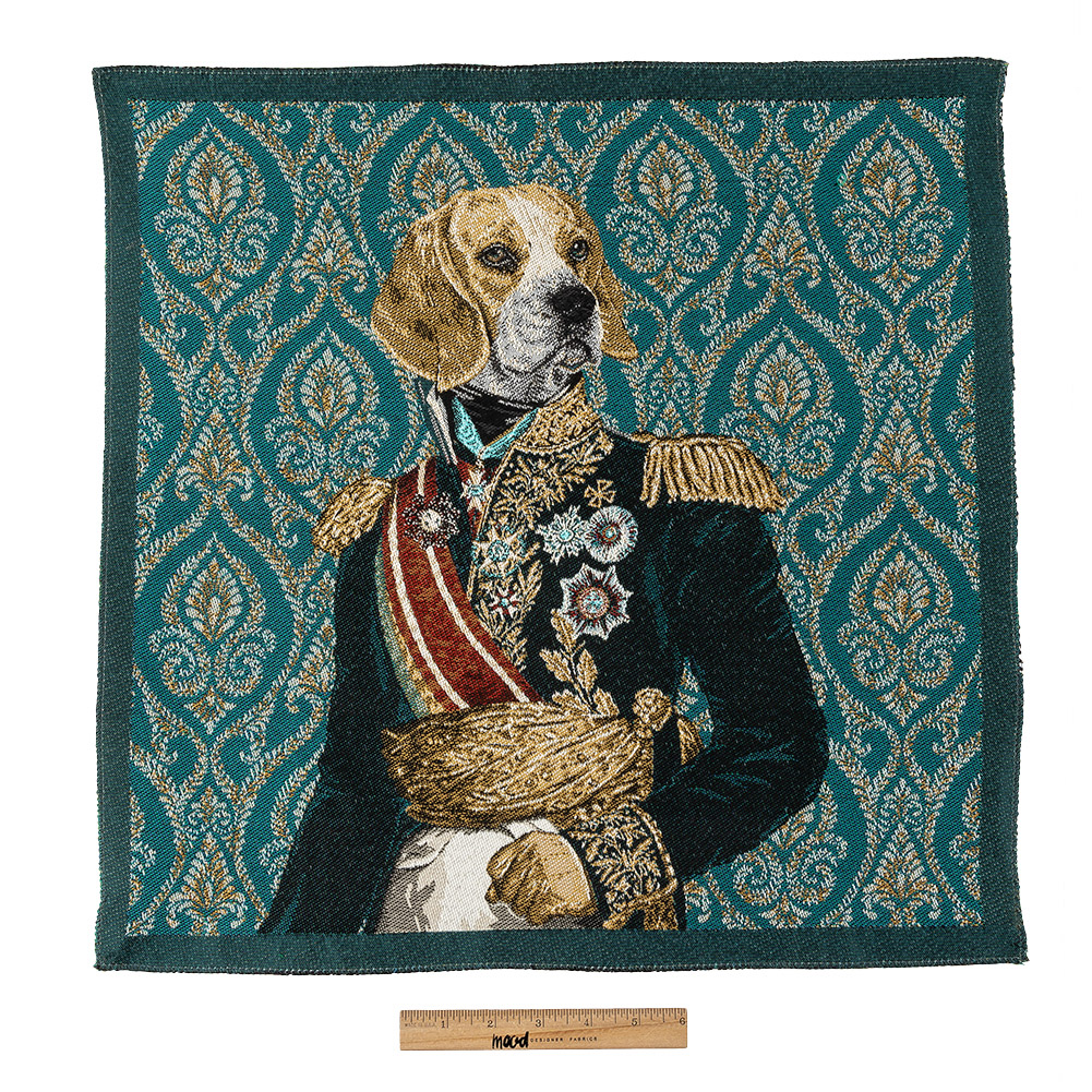 The woof, the woof is on fire. Our Teal Woof Marshal Cotton Blend Oversized Square Patch is coming in hot and full of Wes Anderson energy. Over a teal, grayish blue, and gold paisley background stands a righteous canine donning a velvet decorated coat with golden epaulettes and an intricate sash around his waist to match. Imported from France, you'll find it easy to make a stylish statement using this oversized appliqué. Sew this patch onto leather moto jackets, throw pillows that will bring your living room to life, totes that carry art books and French literature, or frame it and have your very own camp-dedicated corner.Please note: Due to the unique construction of each patch, the dimensions may vary from piece to piece and are roughly 18⅞" x 18⅞"—which includes between ½"-¾" of a selvage around all four sides. WARNING: Cancer and Reproductive Harm - www.P65Warnings.ca.gov.