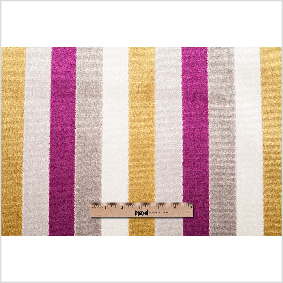 Bring forth style in any interior setting utilizing this vertically striped velvet! Made from cotton, polyester and viscose, this striped velvet is not only luminous, but super soft to the touch. Of a medium weight and with a crisper, sturdier drape, this velvet home decor fabric would be a great option for distinctive upholstery, heavier drapes, and bold decorative applications. This material comes in five different colorways and consists of a woven backing.
