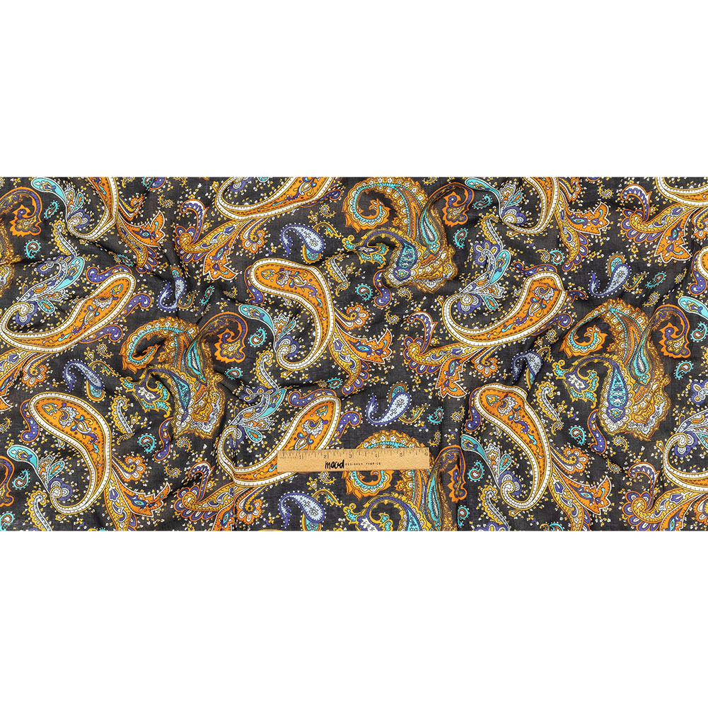 Planning your dream Hawaiian vacation? Make sure to pack our Midnight Navy, Hawaiian Sunset and Limoges Paisley Gauzy Cotton Voile! Orange, cobalt blue, and yellow paisleys cavort over a midnight navy ground. Soft with an airy, lightweight, and fluid drape, combine ethereal and free-spirited aesthetics by designing dusters, peasant blouses, or nap dresses. Sheer, insert a lining when a raised opacity is desired.