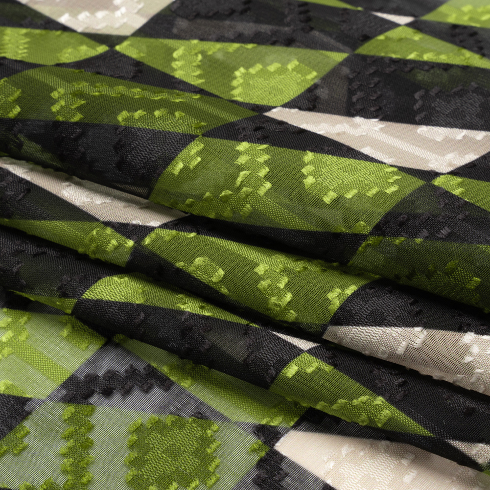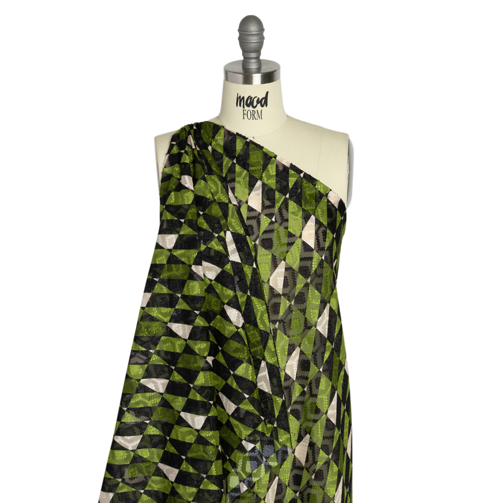 Check this Mood Exclusive Green Healthshire Hills Geometric Burnout Polyester Woven out! This polyester fabric features two prominent patterns; one printed and the other produced by the fabric construction. On a burnout fabric, a chemical process dissolves sections to create a pattern among sheer and opaque areas. With this specific burnout, lustrous honeycombs and diamonds were left behind to cover green and black checkers and dashes, creating a slick yet dimensional hand and a truly unique face. Enjoy the lightweight, billowing drape as you don airy dresses, elegant blouses, and stunning handkerchief skirts, or create accessories like headscarves, sarongs, and more! A lining is suggested if total opacity is desired.