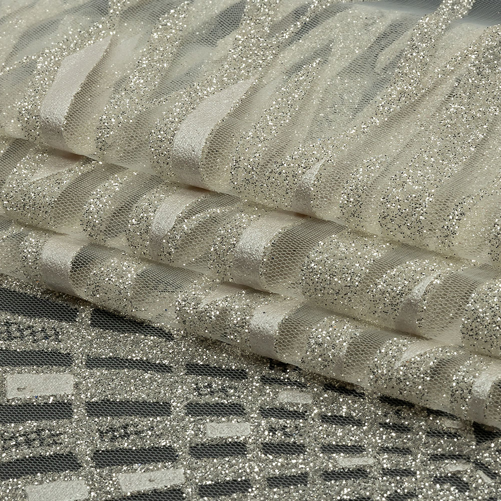 Geometric Feathers Glitter Tulle - Off White and Silver