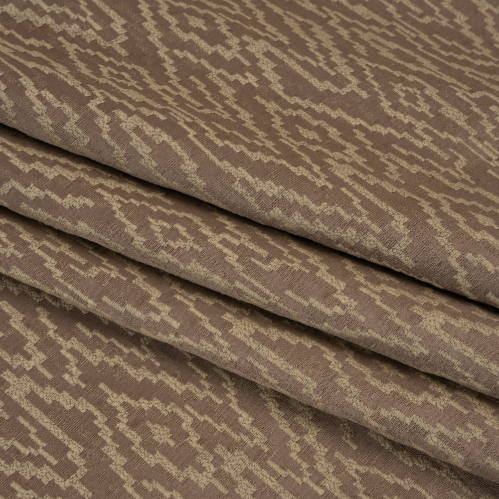 Muted tones, recycled fibers, and a sleek but textural feel ensure this Rosewood Geometric Drapery Jacquard is not a fabric to be missed, no matter your drapery goals!Suggested Projects: Curtains, Valances, Drapes, ShadesContent: 65% Recycled Polyester, 28% Cotton, 7% PolyesterStretch: NoneOpacity: Mostly OpaqueThis fabric encourages you to lead with romance as you design your dream home. A beige geometric pattern rises from the lustrous dusty rose background, bringing depth to the face with its embroidered-like hand. Supple, relatively lightweight, and soft, this eco-friendly fabric dreams of tall windows to adorn, elegant bed frames to drape across, and formal dining rooms to elevate. Mostly opaque; a lining will add complete opacity and structure if desired.