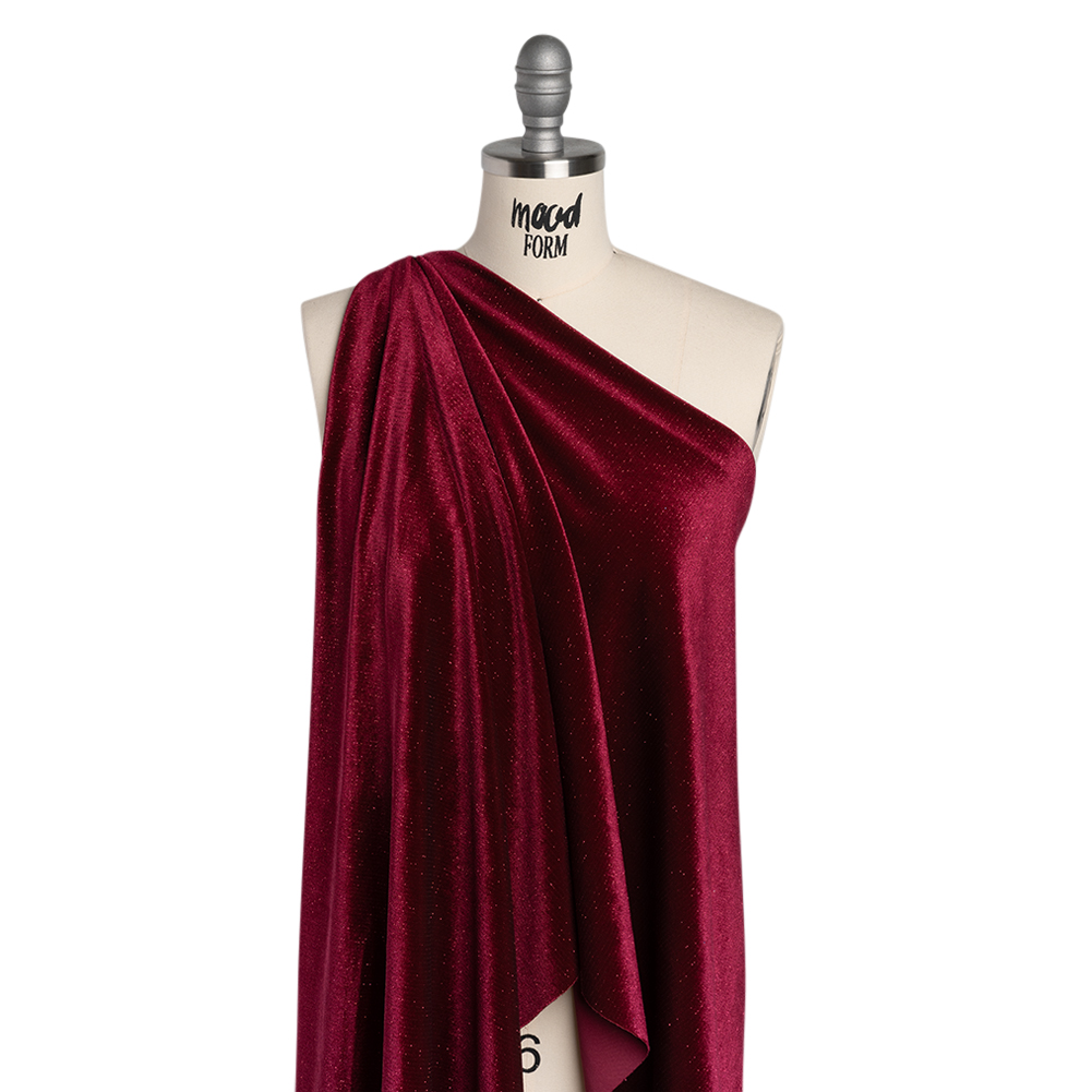 You’ll fall in love with this Burgundy Glitter Stretch Polyester Velour. With a plush, slightly tactile hand and malleable drape, it’s perfect for casual and formal attire alike.Suggested Projects: Dresses, Pants, Jackets, TopsContent: 95% Polyester, 5% SpandexStretch: 45% WeftwiseOpacity: Slightly TranslucentA touch of pixie dust graces this ribbed burgundy velour, casting a glimmering sheen that shimmers with endless design potential. With a 45% stretch through the weft, its plush, velvety hand and supple drape move with you, wrapping the body in luxurious comfort. Luminous, glittering, and irresistibly soft, this fabric is perfect for crafting sultry cocktail dresses, velvety tracksuits, curve-hugging turtlenecks, and more. Slightly translucent, it pairs beautifully with a lining for added opacity and a polished, finished look.