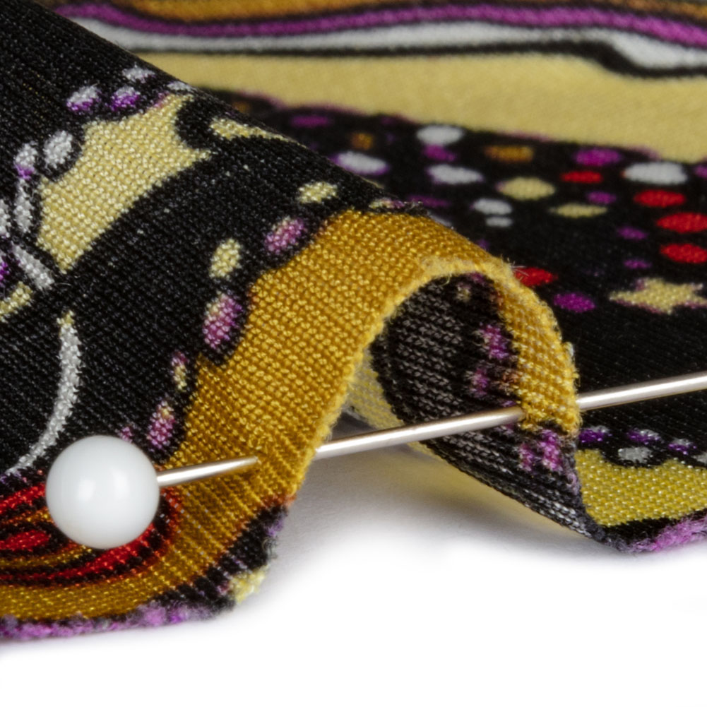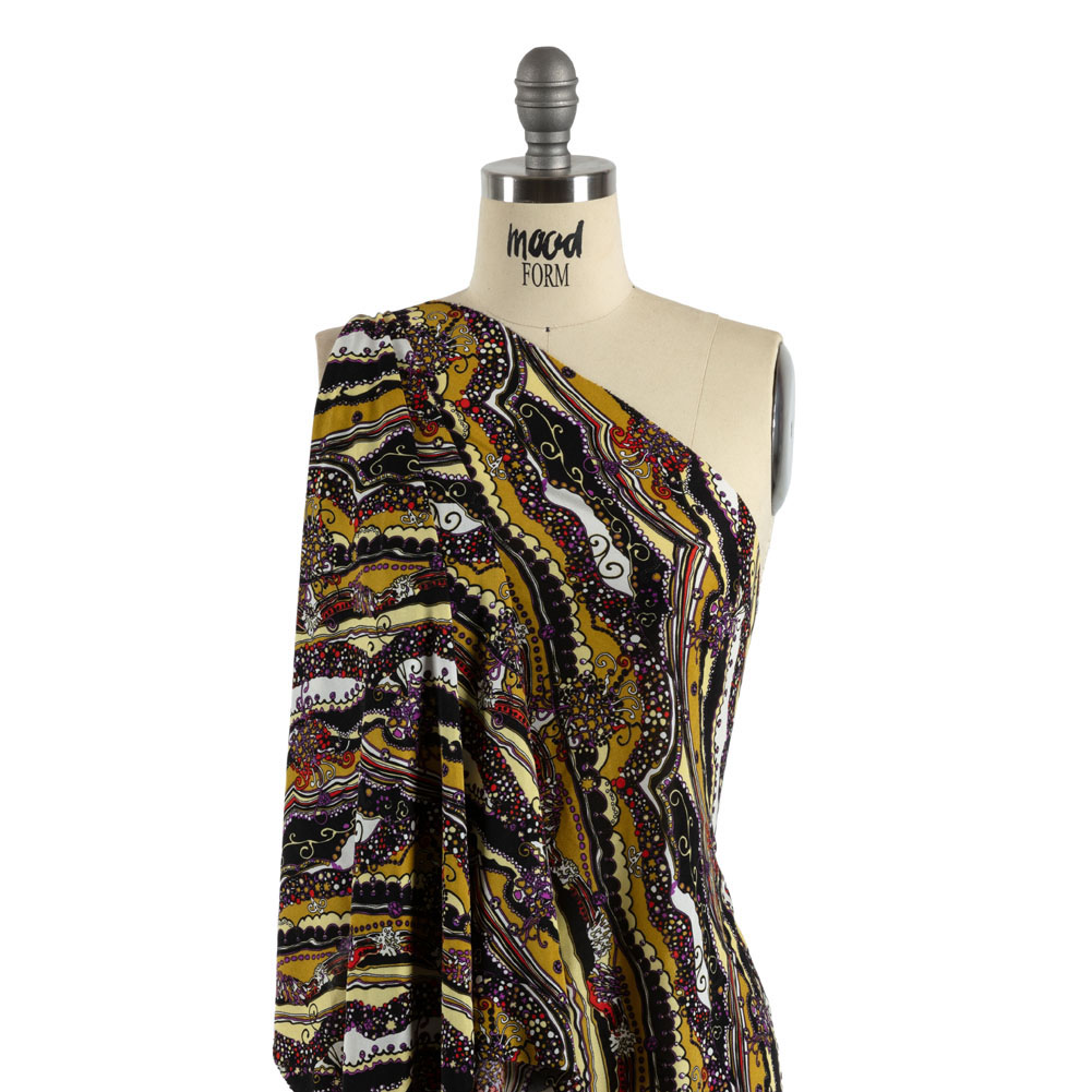 This Gold, Purple and Black Fancy Diagonal Stripes Silk Jersey proves that fancy can be comfortable! An unsteady hand draws thinly layered scallops, sprawling tendrils, ornate bouquets, and bursting boughs of berries across the lustrous face.