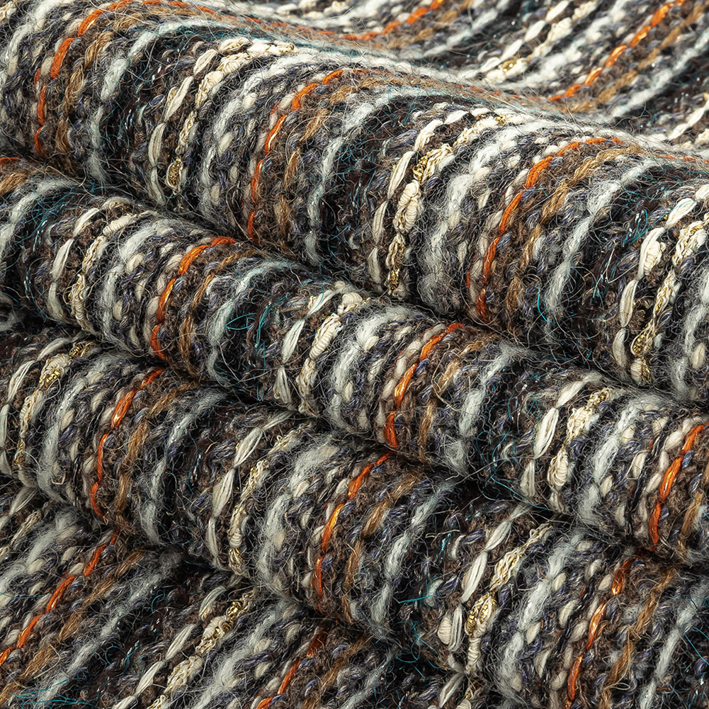 Like sparkling lights on late autumn nights, this Gray, Gold Flame and Metallic Gold Striped Chunky Wool Knit just shimmers! Metallic gold threads twist with orange and white yarns that form just some of the stripes in this knit, the rest in shades of cool gray and taupe. With a nearly 50% stretch through the length and 75% stretch in the width, use the thick, yet flexible drape to create chunky oversized cardigans, sweater dresses that are perfect for lazy winter days, or accessories like hats and scarves. With a slightly open construction, a lining may be desired for opacity and comfort in wear but isn't necessary.