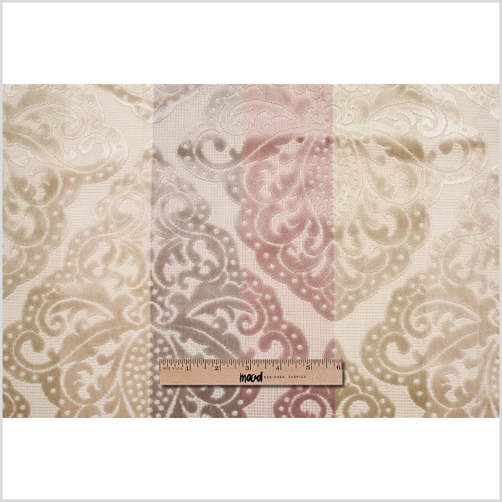 Brought to Mood all the way from Turkey, we have an excitingly luminescent, laser-cut velvet made from nylon, polyester, and viscose. Not only does this fabric feature wide stripes, but is covered by a large damask pattern as well. This material is of a medium weight and contains a fantastic soft, yet textural hand. With it's stiffer drape, this fabric would be great for distinctive upholstery, heavier drapes, and bold home decor applications. This material comes in five different colorways and consists of a woven backing.