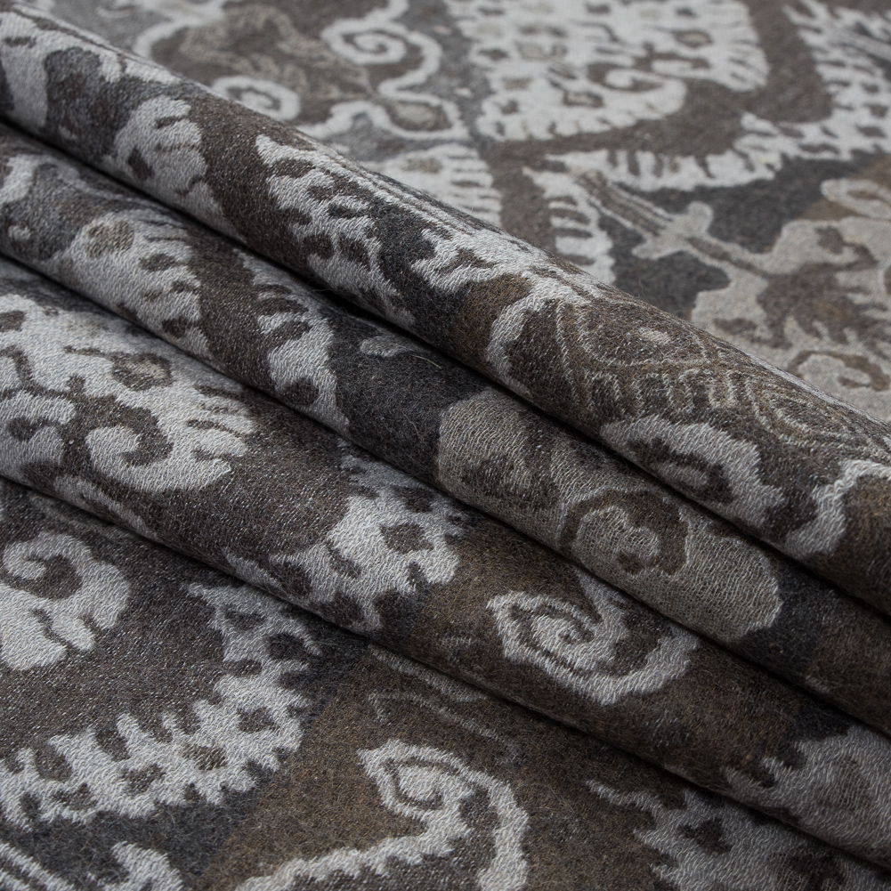 Earthy and uniquely made, don't miss out on this Gray Tribal Damask Wool Woven. Presenting a design that references antique Persian rugs, its pattern has the jagged edges of an ikat and the ornate motifs and placement of a damask. The soft, fuzzy woven presents an mix of muted shades that create a cozy and eclectic look in your home. Thin with a heavier weight, it is an ideal choice for upholstery applications. Add it to lounge chairs, ottomans, floor cushions and more! Finish its edges with a nice trim and use it as a decorative rug too. Note that it is opaque and has a flexible drape.