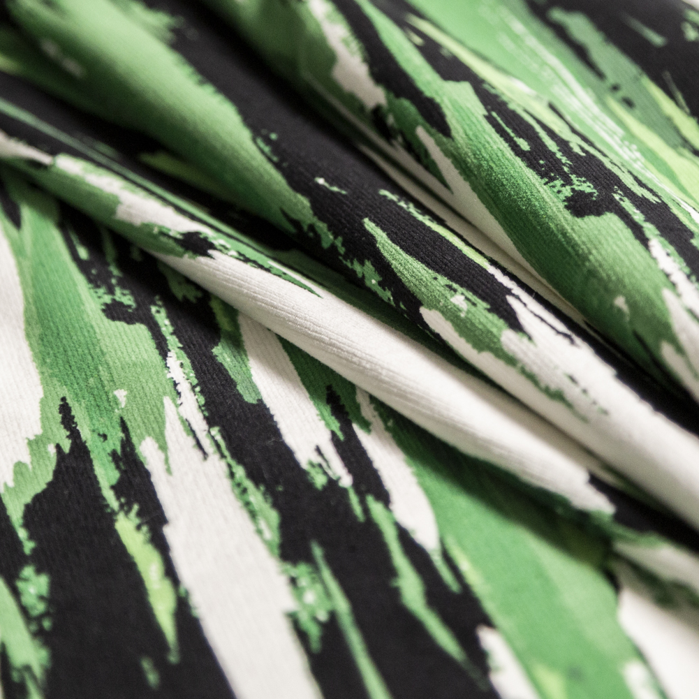 Make your daring couture visions a reality with our Green Abstract Stripes Stretch Cotton Corduroy. Featuring camouflage-like, abstract stripes in an eclectic colorway, it cannot be denied that this stretch cotton corduroy has a magnetic charm. Thin and lightweight, it comes with a voluminous drape and a rather crisp hand for a corduroy base. The moderate stretch along the weft makes this fabric a great choice for form-fitting creations such as pencil skirts, cropped pants, and more! Opaque, a lining may be added for additional comfort.