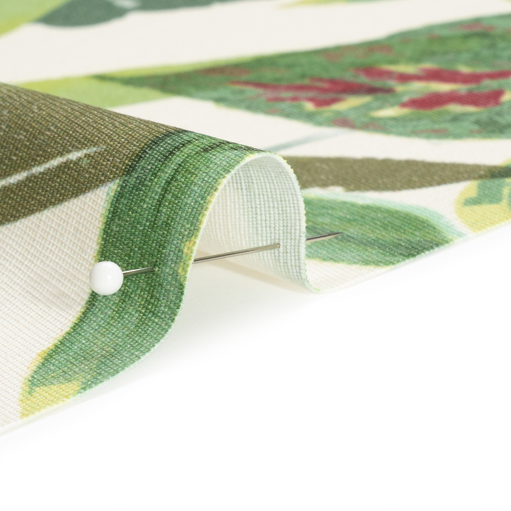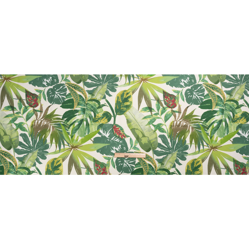 With this Green and Cream Tropical Leaves Printed Polyester Canvas, decorate with the vivacious life of the jungle floor! A tropical scene of large leaves is painted against an off-white background, with hints of maroon coloring for a satisfying deviation from the green color scheme.
