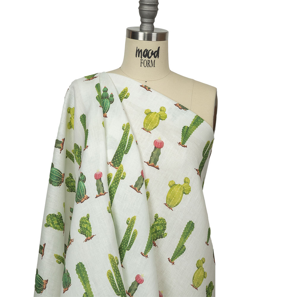 You'll look sharp in this Green and Ivory Cactuses Medium Weight Linen Woven! A cornucopia of cactuses (or is it cacti?) in all different shapes and sizes, some bearing pink flowers, dance in a directional pattern over an ivory ground. Cool and slubbed in hand with a crisp, malleable drape, create sweet sundresses, playful rompers, or gathered skirts, and be sure to account for the lack of stretch in your patterns! Somewhat translucent, particularly in light-colored areas, a lining may be added for additional opacity and a polished finish but isn't strictly necessary.
