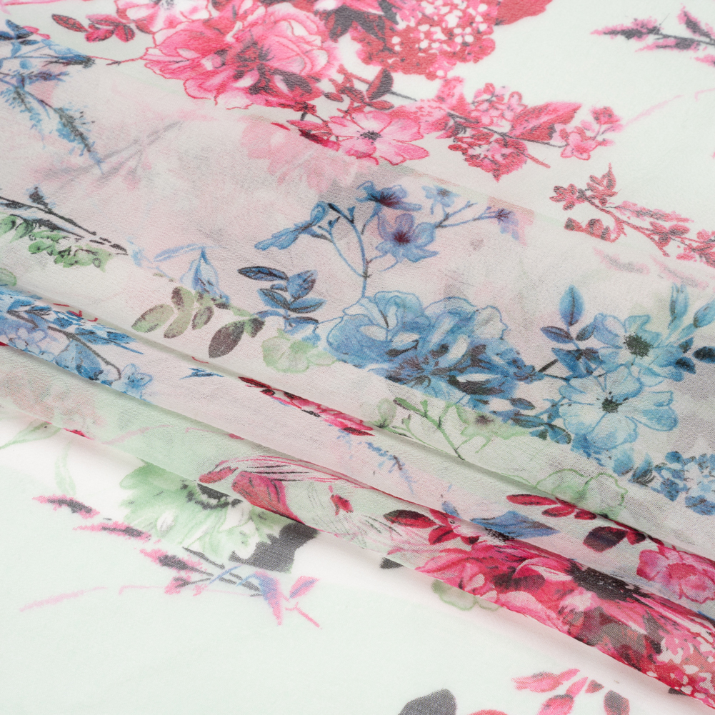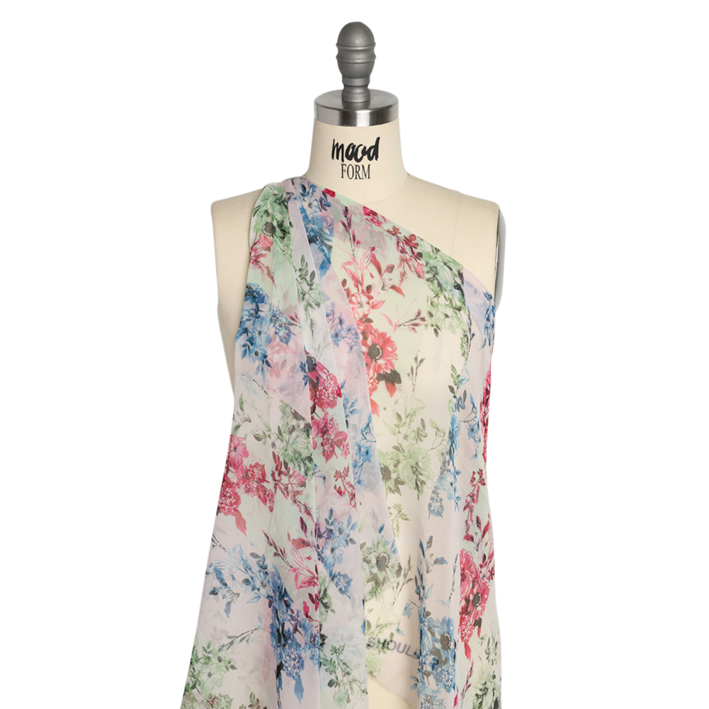 Pastel pleasantries present this Green, Blue and Pink Floral Wavy Stripes Silk Chiffon in a preppy light. Wavy mint and pale pink stripes of different widths display bunches of blue, fuchsia, and green flowers. Romanticize any silhouette with silk chiffon’s sheer quality and airy drape. A sleek yet slightly grainy hand accompanies this ethereal fabric, inspiring floor-length gowns, dusters, blouses with ruffled sleeves, scarves, and more. A tip from our sewists: do not feel intimidated by sewing this delicate fabric; using a rotary cutter (or sharp scissors and sharp pins), fine needles, tight stitching, French seams, and patience, anyone can show up to a special occasion wearing a silk chiffon garment they created themselves!