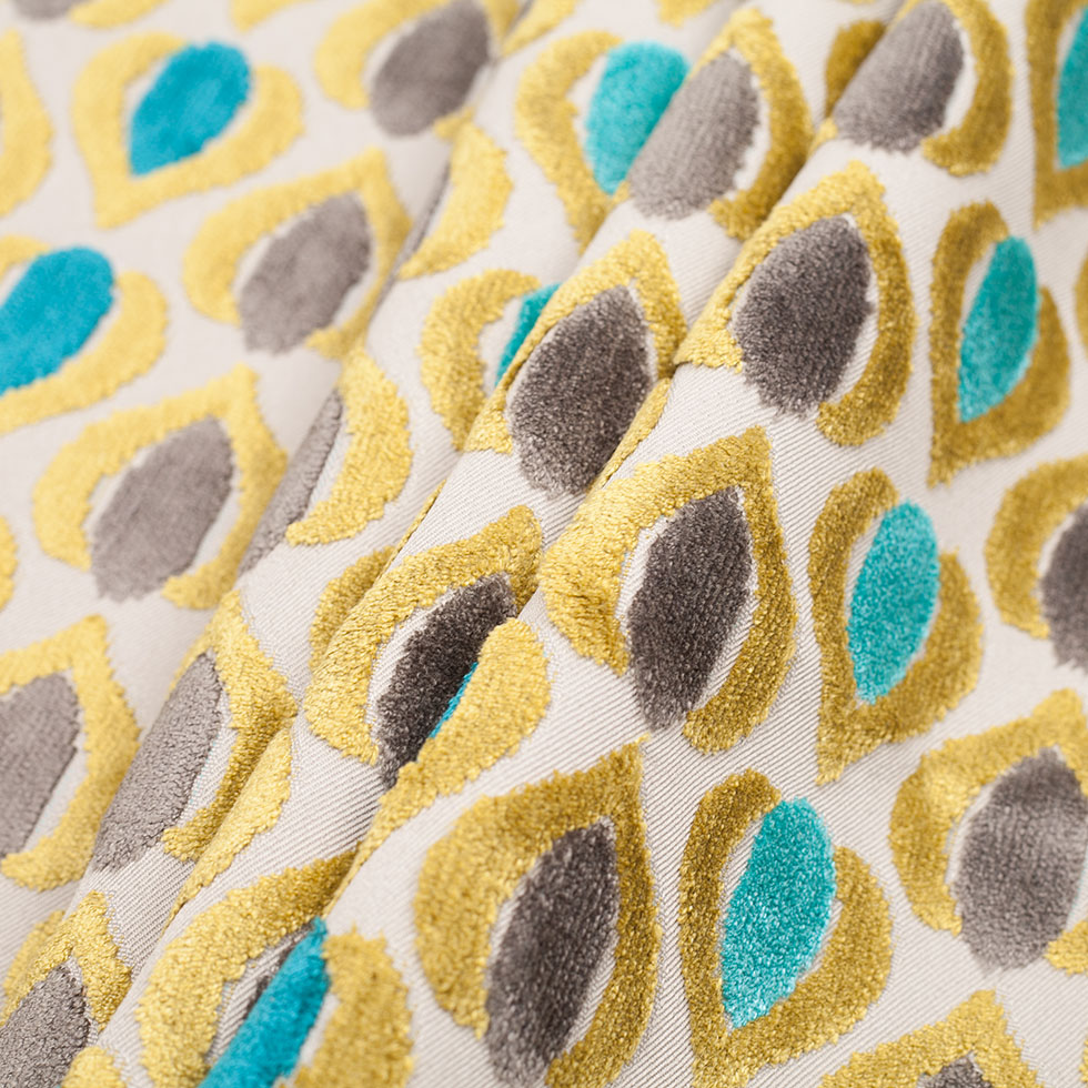 Dare to decorate with texturally divine home decor fabrications? Here is a laser-cut geometric velvet that may just strike your fancy. Layered on top of a neutral twill remains a laser-cut velvet design full of leaf-like geometric shapes. With just a subtle sheen, a sturdy hand, and a stiffer drape, this medium to heavy weight velvet would serve best as an upholstery fabric.