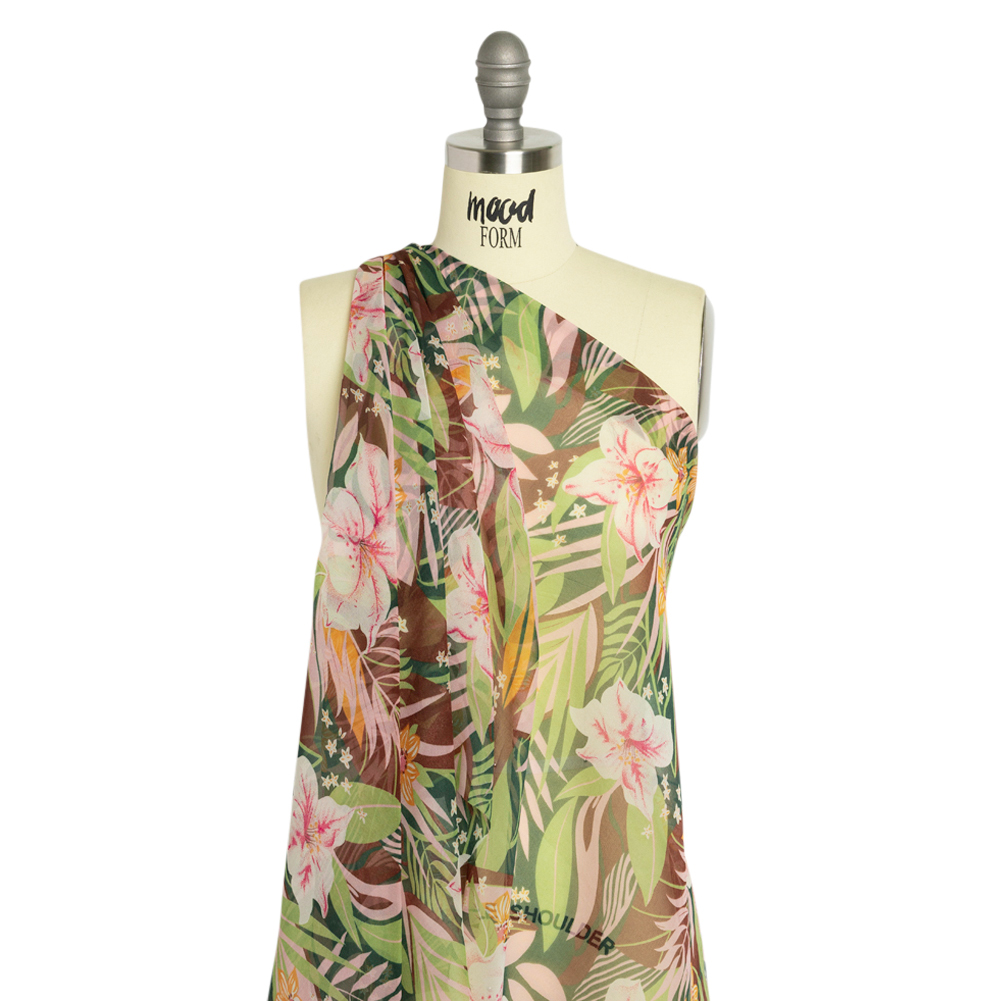 Green, Brown and Pink Tropical Flora Silk Chiffon