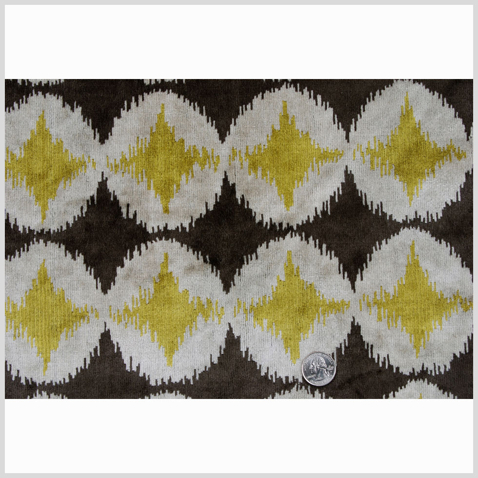 Dramatic upholstery-velvet in an ikat pattern of chartreuse, light gray and slate. Suitable for upholstery and other home decor applications.