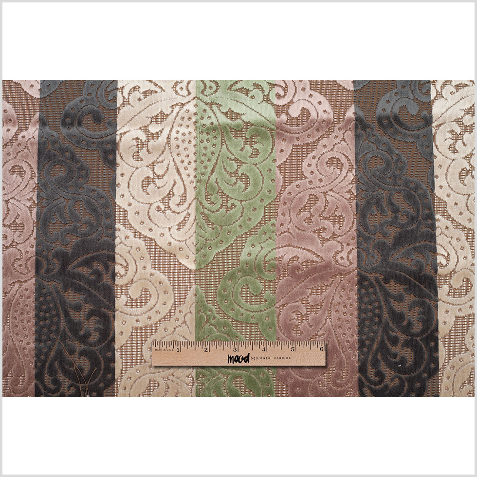 Brought to Mood all the way from Turkey, we have an excitingly luminescent, laser-cut velvet made from nylon, polyester, and viscose. Not only does this fabric feature wide stripes, but is covered by a large damask pattern as well. This material is of a medium weight and contains a fantastic soft, yet textural hand. With it's stiffer drape, this fabric would be great for distinctive upholstery, heavier drapes, and bold home decor applications. This material comes in five different colorways and consists of a woven backing.