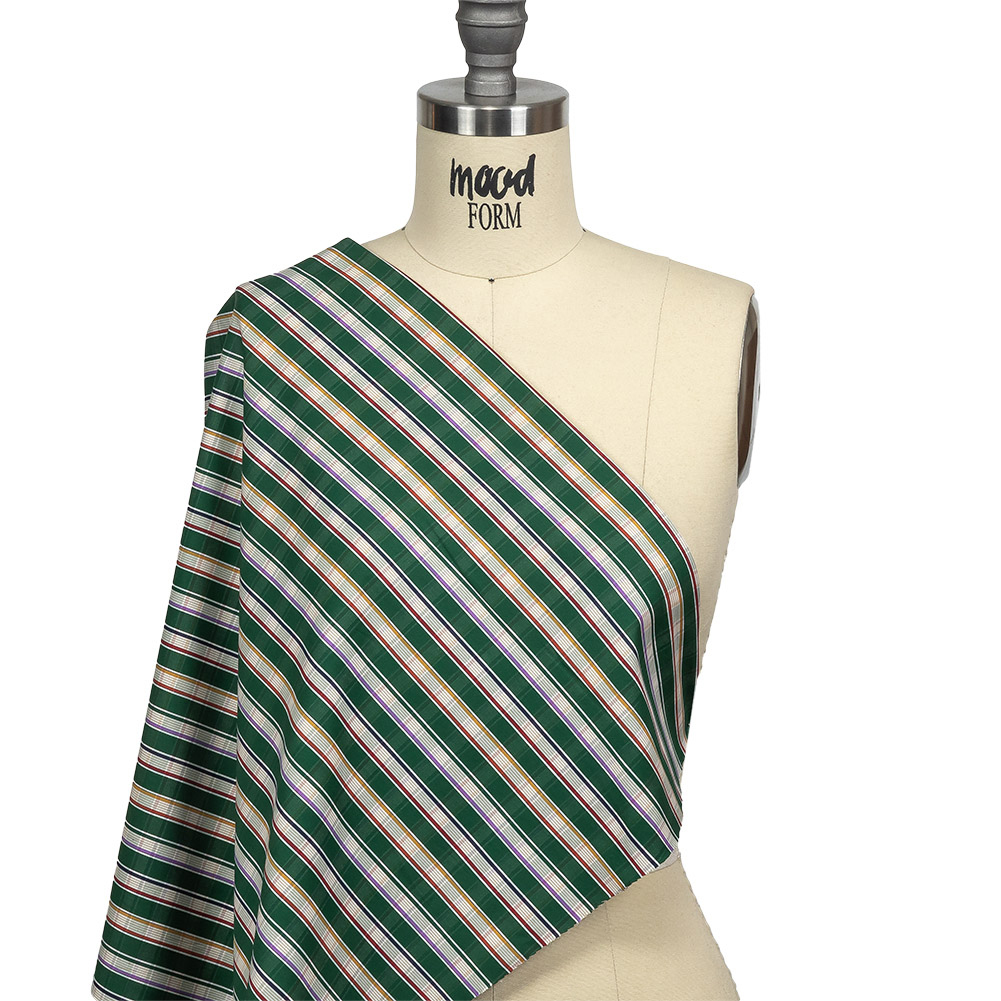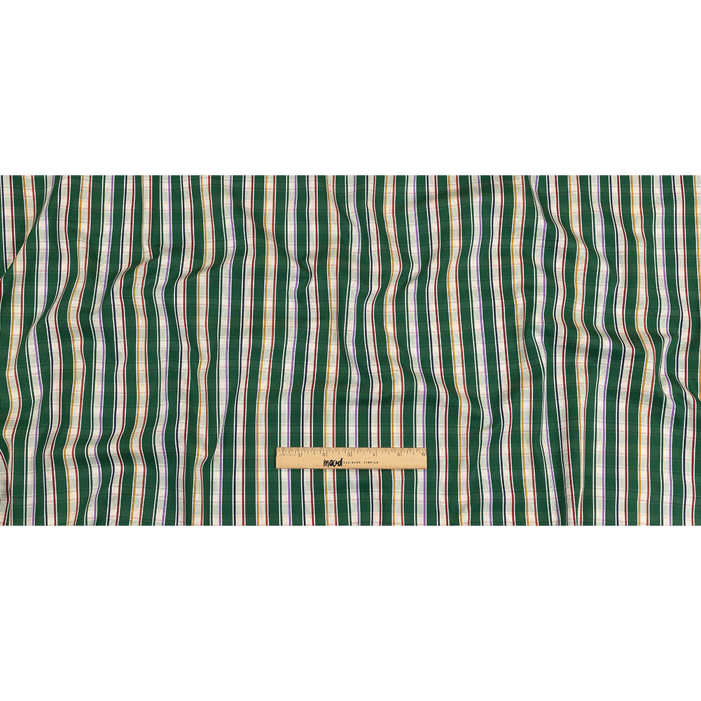 For your next trip along the Yellow Brick Road, why not follow our magical Green, Purple and Yellow Subtle Plaid Stripes Cotton Shirting? Ghostly tone-on-tone stripes bisect multicolored stripes, all pulling focus to the emerald green shade.