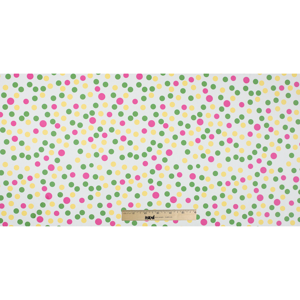 Spring into warmer weather in style with this Green, Yellow and Pink Polka Dots Printed Cotton Poplin! Grass green, bright yellow, and popping pink polka dots bounce against a soft white ground.