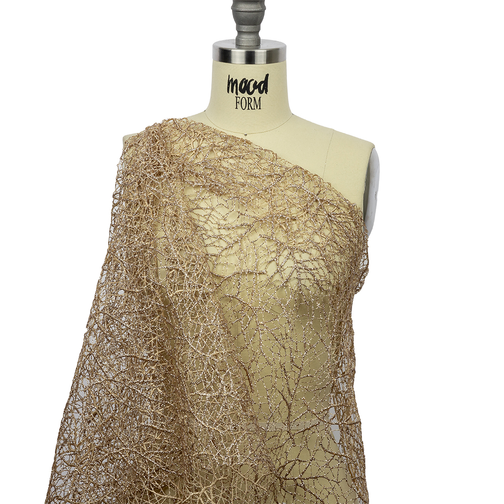Bring a radiant glow to your designs with this Warm Beige Webbed Branches Glitter Guipure Lace! Designed with a web of thinner threads holding a thicker branch-like pattern, the face of this intricate lace features a somewhat coarse hand thanks to a finish of silvery glitter on its surface, while the reverse allows warm beige threads to shine. With a malleable and slightly structured drape, make a grand, first impression by creating a couture dress or skirt, formal blouse, or evening shawl! Fairly see-through thanks to its openwork construction, add a lining for complete opacity and comfortability, and make it a contrast color for extra oomph!