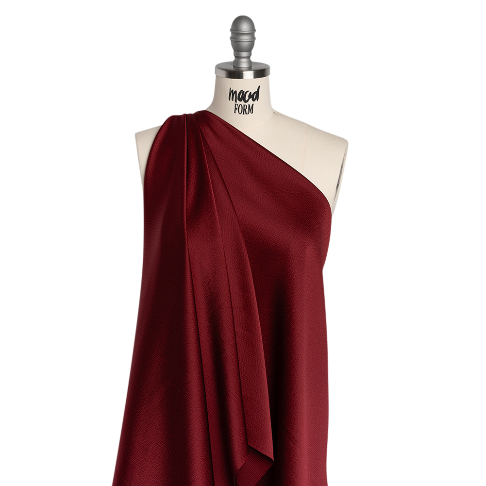 Pour this Wine Red Hammered Polyester Satin over your next design—featuring a sleek yet slightly tactile hand and fluid drape.Suggested Projects: Shirts, Pants, Dresses, SkirtsContent: 98% Polyester, 2% SpandexStretch: NoneOpacity: Slightly TranslucentThe elegance of this wine red polyester satin will only get better with time. In stark contrast to the matte, grainy reverse, the face boasts a sleek, slightly tactile hand—thanks to a hammered finish—and slight luster. To emphasize the fluid drape, create billowing gowns, maxi skirts, and shawls, or achieve a more casual style with delicate tank tops, flowing robes, and wide-legged pants. Slightly translucent, we recommend adding a lining for ensured opacity and comfort.