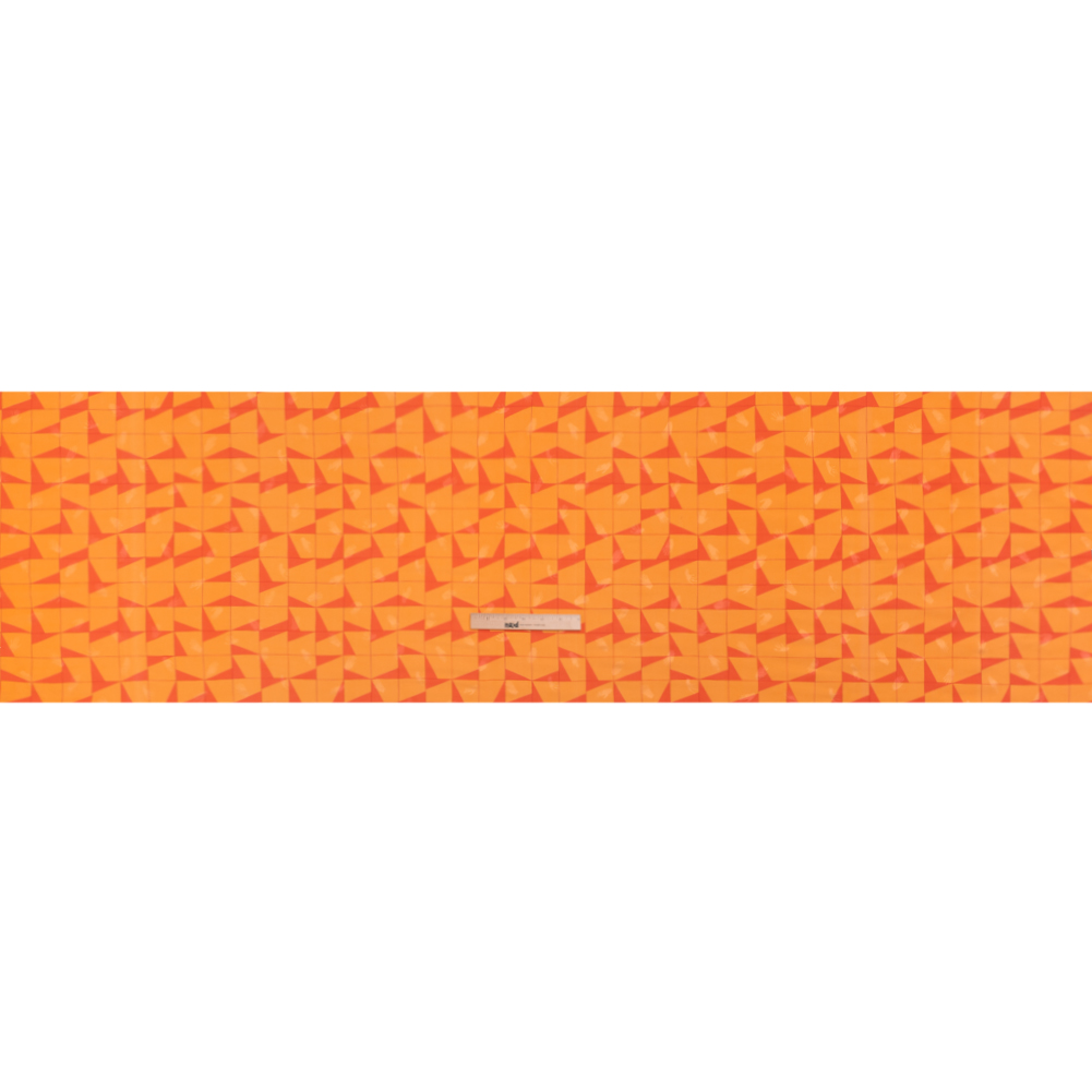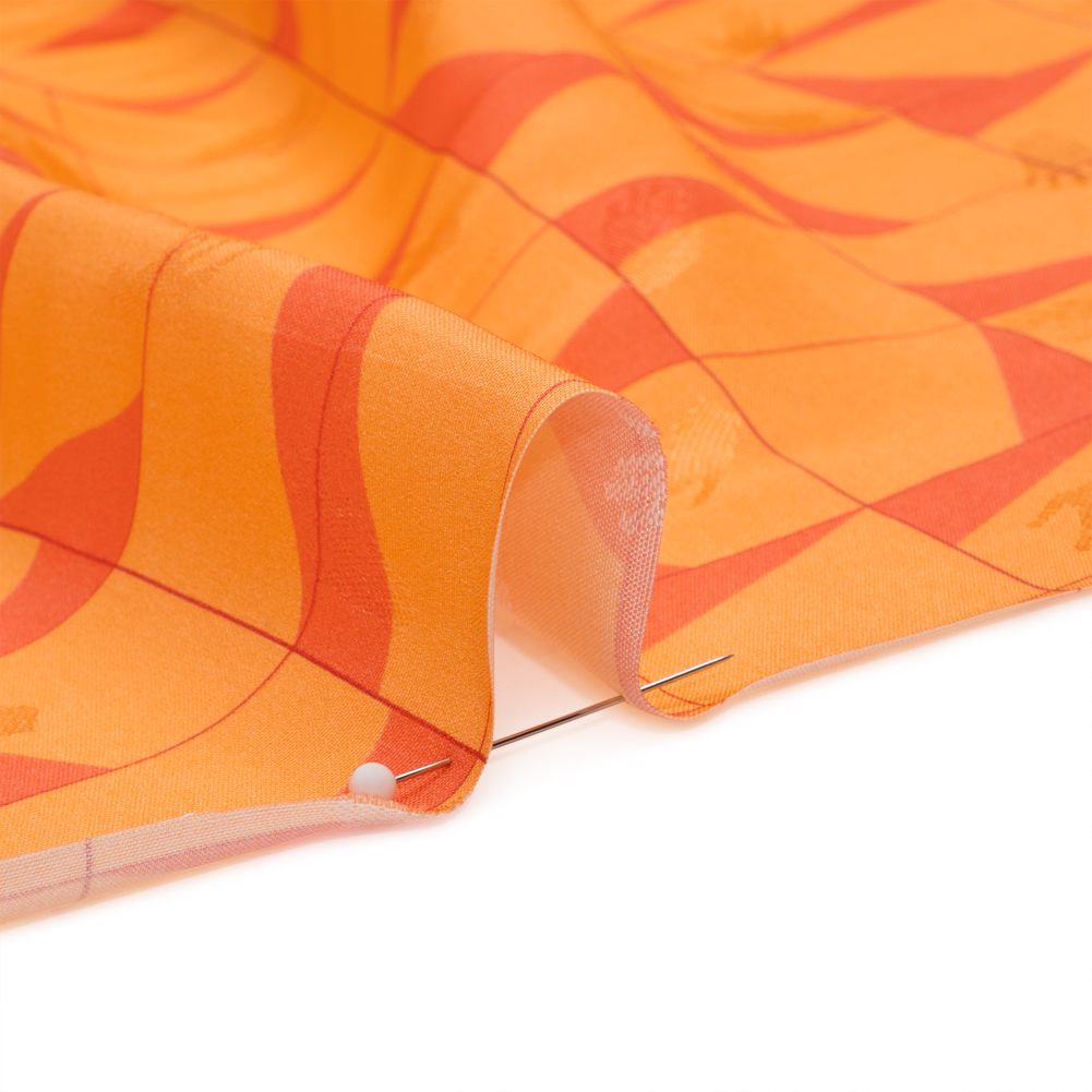 Our Mood Exclusive Theorem Thoughts Hands Viscose Jacquard is proven to be a style enhancer. Reddish-orange triangles cozy themselves into a corner of each square on a grid, creating an irregular pattern across the bright orange face. In a way that makes you feel like they've got everything under control, Jacquards never overlook the details—in fact, that is where their expertise lies, thanks to their complex weave. Dress confidently knowing that this Jacquard, with hand silhouettes rising slightly from the face, will bring your unique personality to formalwear looks, elevating any garment its luster and luxuriously dimensional texture. Supple in drape and sleek in hand, create two-piece suit sets, mini skirts, gowns, and more. Semi-transparent; a lining may be desired for added opacity and structure.