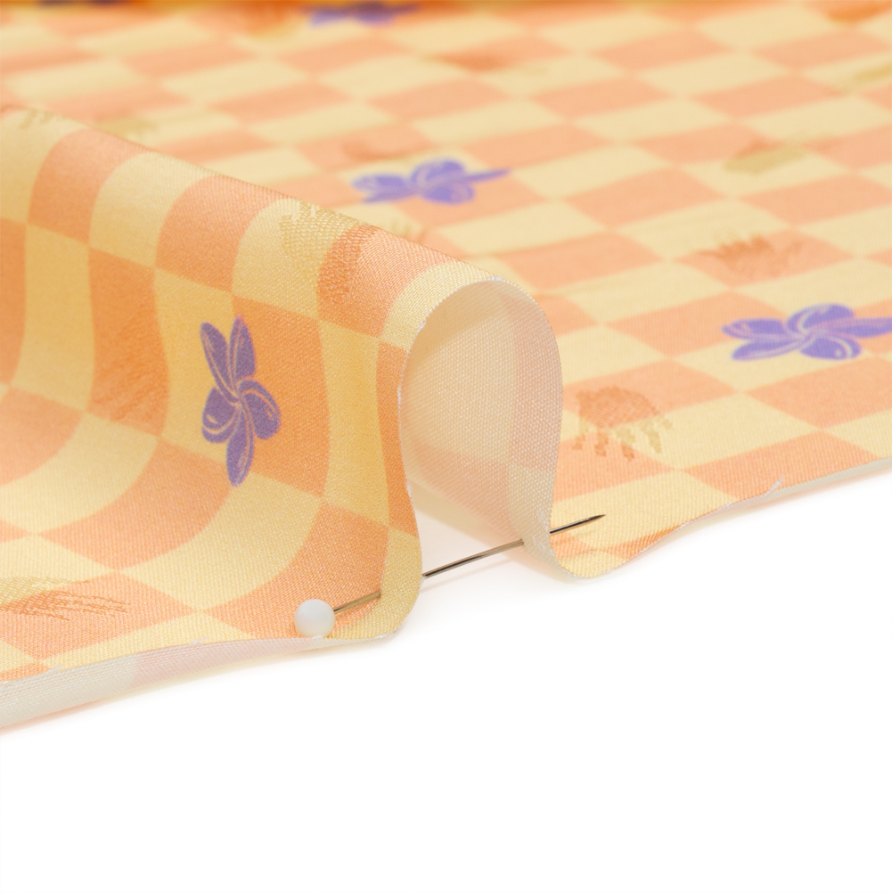 From trendy to timeless, our Mood Exclusive Peach Dippin’ Disco Hands Viscose Jacquard brings a fresh feel to your formalwear garments as purple flowers dance atop a pale yellow and peach checkerboard.