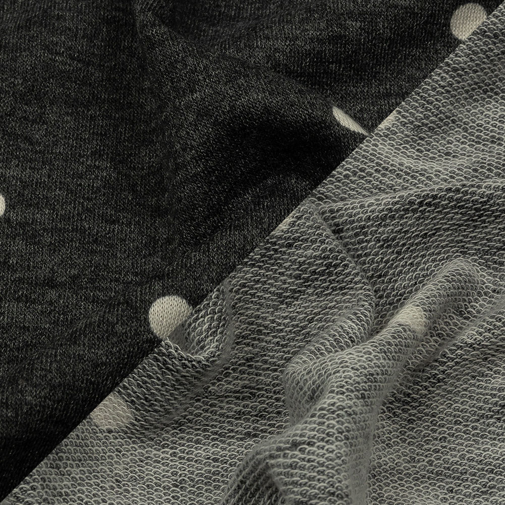 Neutral and classic, this Heathered Bristol Black and White Alyssum Polka Dots Stretch Polyester and Rayon French Terry is perfect for everyday wear. Displaying a dark charcoal backdrop beneath off-white polka dots, this ultra-soft terry features a tactile, looped reverse, a 50% weftwise stretch with a lesser stretch along the warp, and a supple drape. Craft sweaters, cardigans, hooded tees, pajama sets, and pullovers. Opaque, a lining is not necessary for most applications.