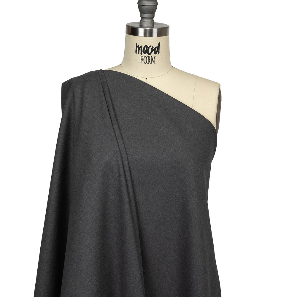 Sharpen up your look with our Heathered Gray Stretch Polyester Suiting! A heathered finish enhances a charcoal gray color for professional appeal. Featuring a notable amount of widthwise stretch, this suiting is cool and smooth to the touch with a malleable drape. Make jackets, trousers, and skirts comfy enough for your whole workday. While opaque, a lining is recommended for a professional look on tailored projects.