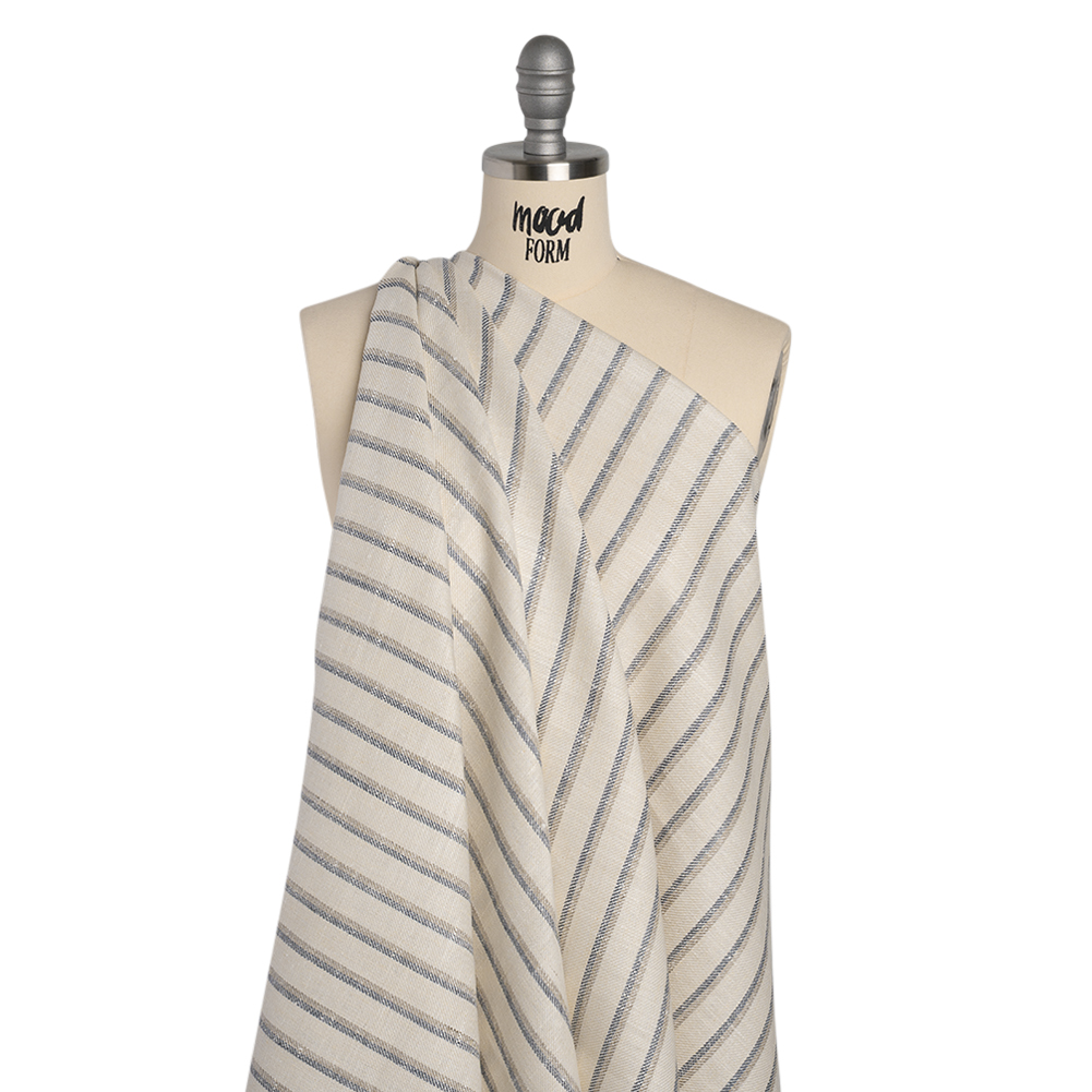 This Shadow Striped Heavy Linen Twill is the next summer sensation—without a shadow of a doubt—featuring a soft, tactile hand and fluid drape.Suggested Projects: Blazers, Shirts, Dresses, PantsContent: LinenStretch: NoneOpacity: Slightly TranslucentBeige and steel blue shadow stripes race across a cream backdrop on this linen twill. With its soft, tactile hand, fluid drape, and heavier weight, it’s a natural choice for warm-weather wardrobes—easily taking you from air-conditioned office hours to after-work summer outings. Think breezy button-ups, tailored trousers, structured blazers, and buttoned midi skirts. Slightly translucent, consider adding a lining for added opacity and polish.