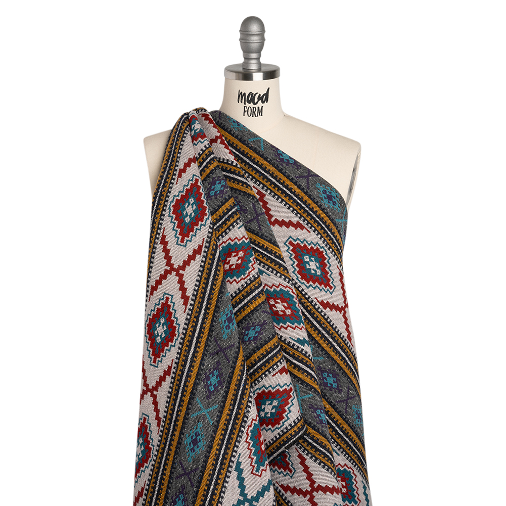 This Southwestern Geometric Striped Heavy Wool Blend Jacquard will keep you warm on your trailblazing adventures—featuring a coarse, tactile hand and structured drape.Suggested Projects: Coats, Jackets, Skirts, DressesContent: Wool, AcrylicStretch: NoneOpacity: OpaqueBrave the desert chill wrapped in this heavy wool blend Jacquard, where bold threads of turquoise, mustard yellow, red, white, purple, navy, and gray intertwine into a striking Southwestern geometric striped design. A tactile weave is joined by a structured drape and coarse hand, making this fabric perfect for autumn coats, structured jackets, ponchos, A-line skirts with pockets, button-up dresses, and more! Opaque, adding a lining will increase structure and add a luxurious finish.