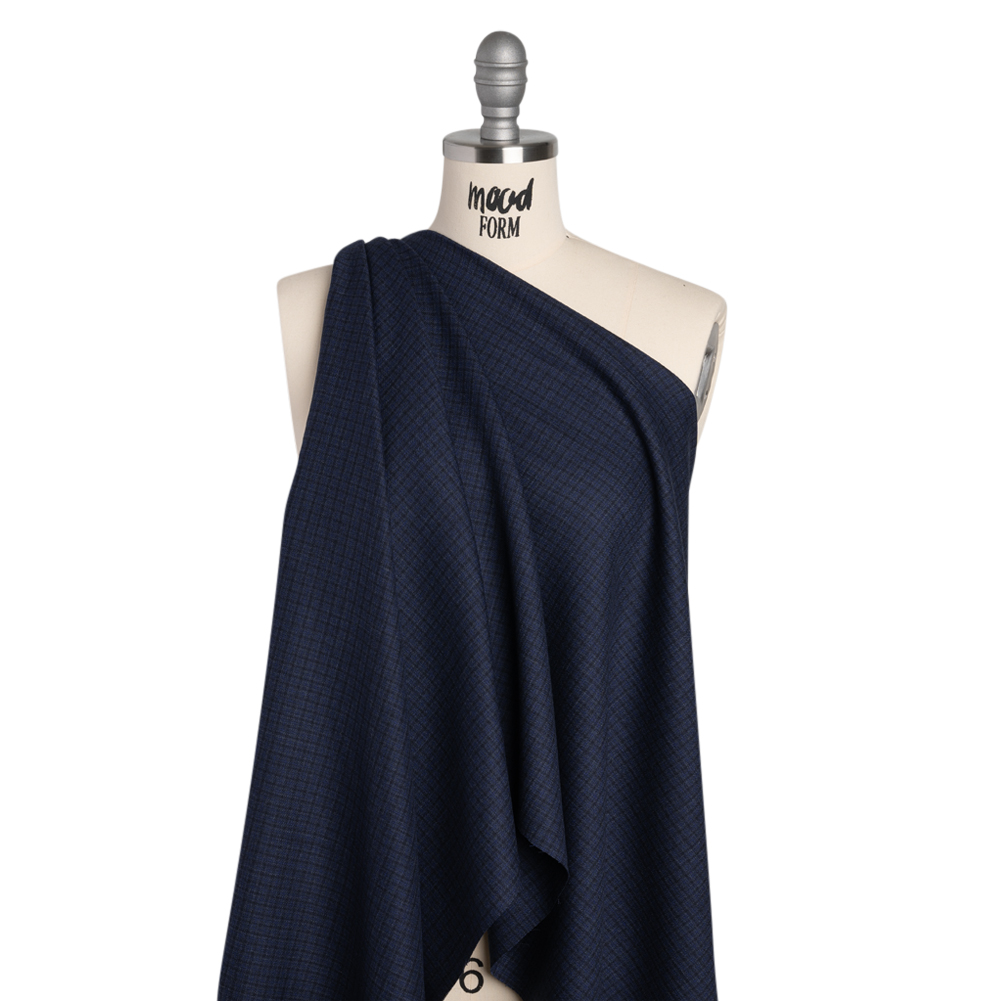 Transport yourself through time, walking the streets of Oxford in this Shepherd’s Check Heavy Wool Twill Suiting. With a soft, slightly fuzzy hand and supple drape, it’ll quickly become a daily staple.Suggested Projects: Pants, Skirts, Dresses, JacketsContent: 100% WoolStretch: NoneOpacity: OpaqueMeld the business look with the casual feel in this twill suiting. Complete with a durable wool construction and a navy blue and black shepherd’s check pattern, this fabric has a supple drape and soft, slightly fuzzy hand that lends itself well to structured applications. Create tailored jackets, trendy blazer dresses, pleated skirts, straight-leg trousers, and so much more! Though opaque, we recommend incorporating a lining for comfort, dimensional stability, and aid in preventing the fine yarns from unraveling at the seams.