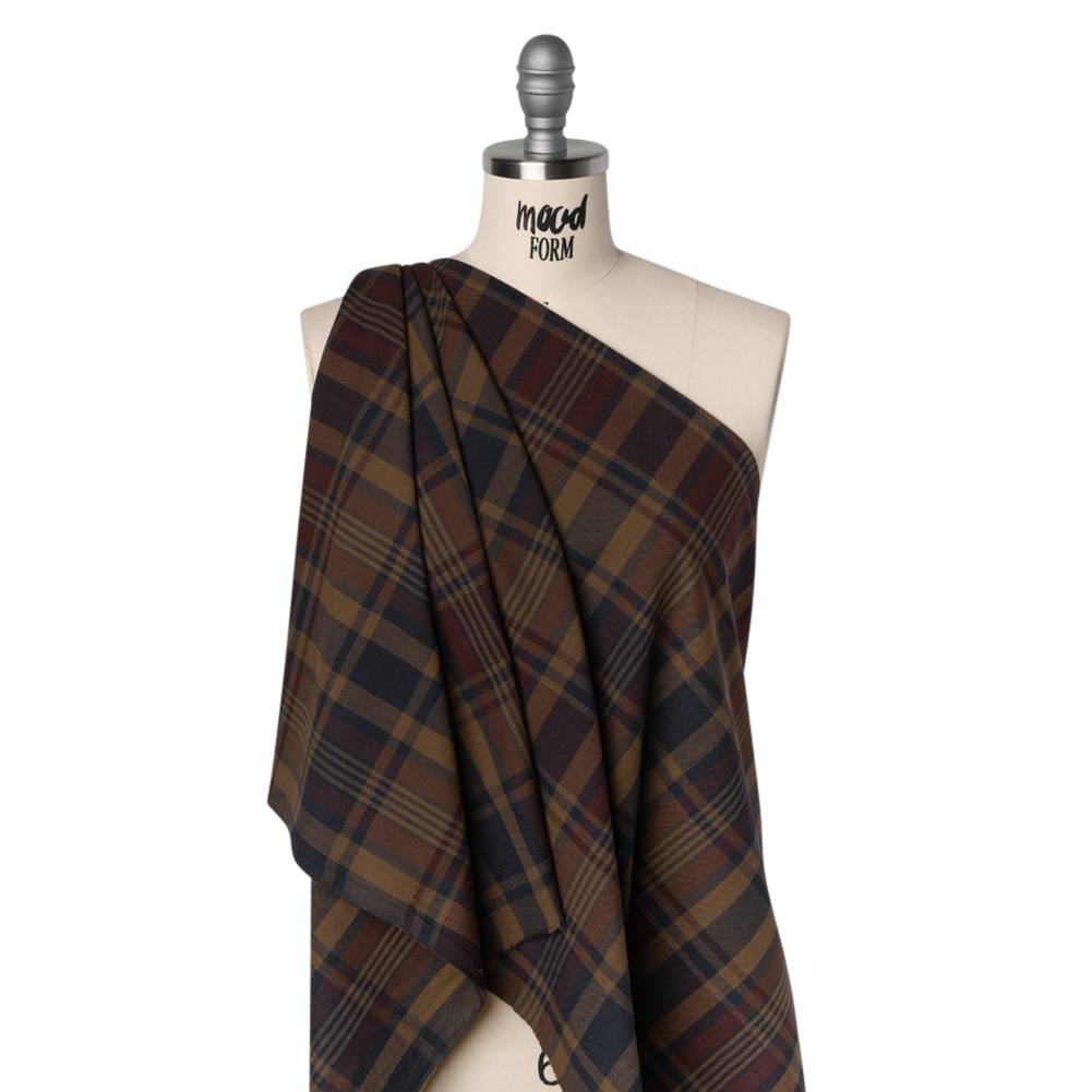 Weave found a way for you to bring your home with you wherever you wander with this Brown, Burgundy and Navy Plaid Homespun Cotton Shirting—featuring a soft hand and supple drape.Suggested Projects: Button-Ups, Blazers, Dresses, TrousersContent: 100% CottonStretch: NoneOpacity: TranslucentCoffee brown, burgundy, and navy threads weave a timeless plaid across this homespun cotton shirting. Its soft hand and supple drape highlight the lightweight, relaxed weave, perfect for easygoing silhouettes. Ideal for casual button-ups, tailored blazers, pinafore dresses, and crisp trousers, this fabric’s translucence makes a lining recommended for added opacity and structure.