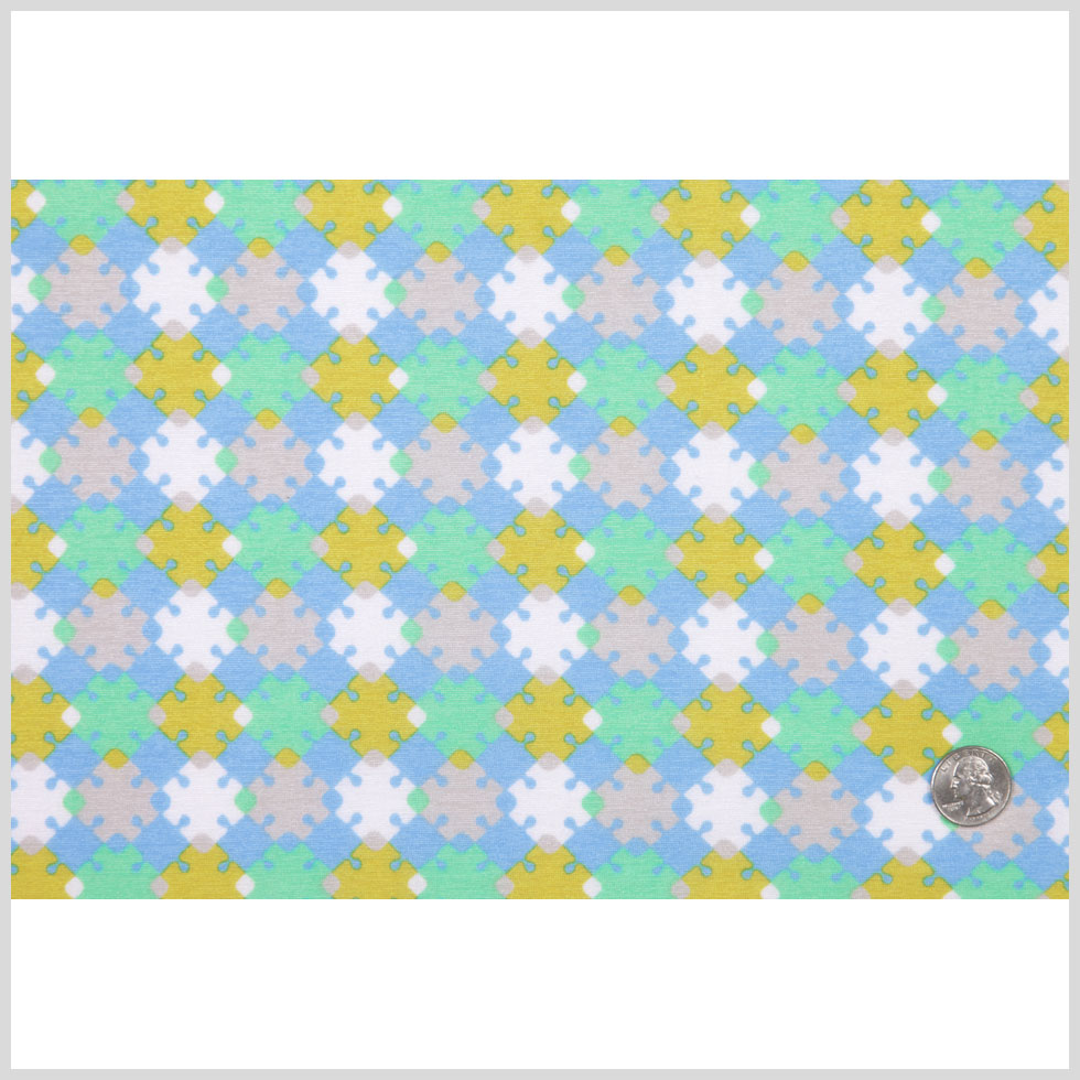 Puzzled? Mood's Horizon Blue, Vibrant Green and Golden Palm Geometric Polyester Jersey will help piece your style together! Featuring colorful puzzle pieces placed in a diamond pattern, its lustrous face and soft, creamy hand make this fabric a true delight. Near-fluid and fluttering in drape with a 50% stretch through the weft, fashion fit-and-flare dresses, skater skirts, and long-sleeved tees. Translucent, a lining would grant true opacity.