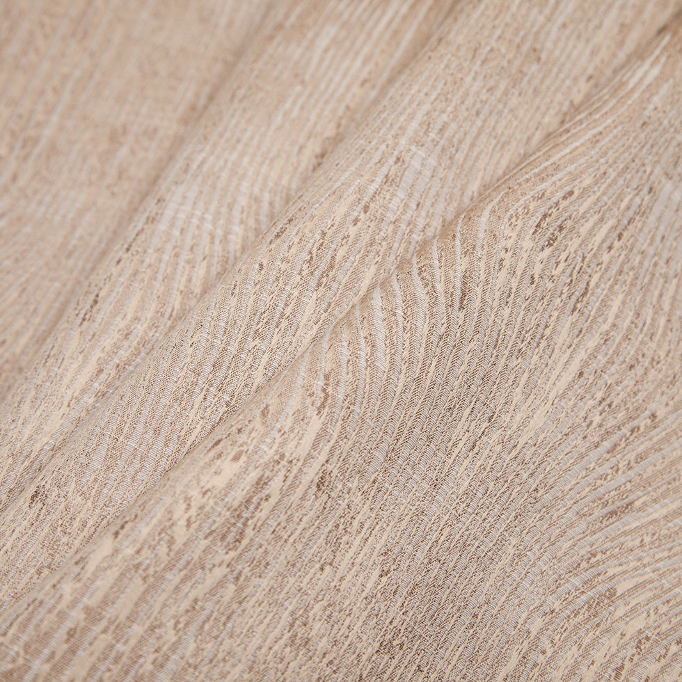 Traveling to Mood all the way from India, we have this wonderfully elegant polyester-cotton home fabric featuring texture upon texture: raised wavy stripes forming geometric oval-like shapes nest on top of a striated, woven background in a beautiful taupe coloration.