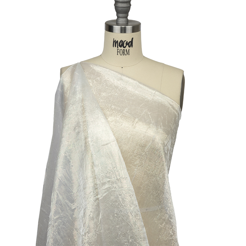 To be Blue or not to be Blue...that's never a question with this Iridescent Rainbow and Blue or Not Crinkled Polyester Organdy. Containing a grainy, crinkled hand, brightly iridescent rainbows dance within a white ground featuring a slightly blue tint. Crisp and voluminous in drape, design wonderful dresses, skirts, and more with this as an overlay. Sheer, a lining can be used for modesty when desired.