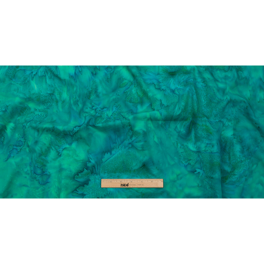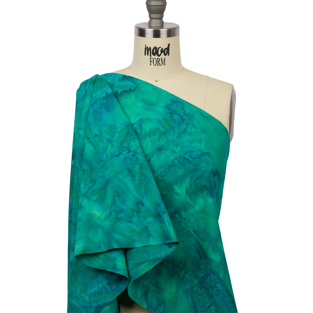 Take a trip to tropical waters with this Island Batiks Foundation Basics Bermuda Abstract Quilting Cotton. Produced with a multi-layered wax resist process, batiks feature an array of designs from abstract to floral and beyond in any number of colors. This particular fabric offers a feathered tie-dyed look in shades of teal and ocean green on a plain weave cotton ground, which provides a crisp, cool hand and softly structured drape.Durable and without stretch, quilting cotton is specially designed for the intricate piecework of creating quilt tops and is equally ideal for home decor and craft projects like pillows, placemats, or table runners. Fashion projects will shine in batik's bold colors, too—use it for vacation-worthy designs such as shift dresses, gathered patchwork skirts, boxy button-down shirts, and shorts. Mostly opaque, a lining is not necessary for most projects but may be used for a polished finish.