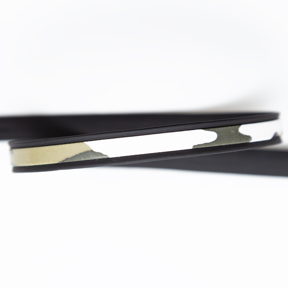 Kindly blend-in our Italian Camouflage Vinyl Striped Rubber Trimming in Black and Green to your design! An elegantly smooth, rubberized backing becomes a matte black border to the glossy strip of stylized camo on this trim’s facing.