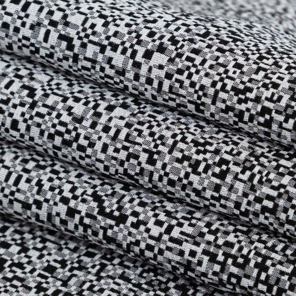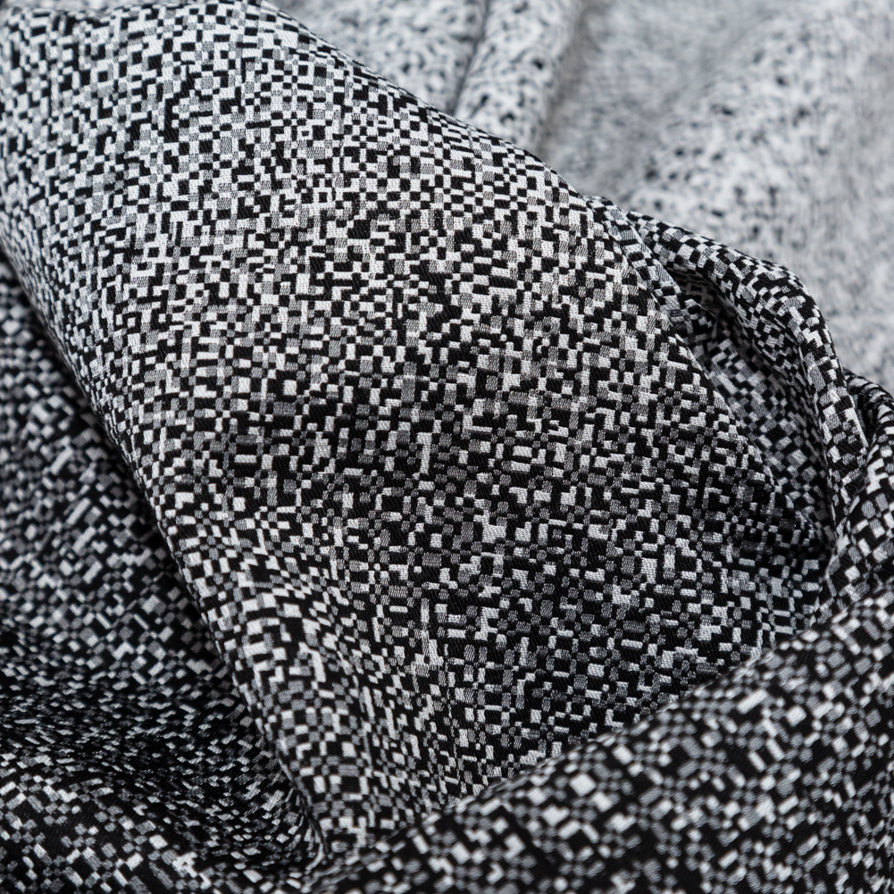 White and gray pixels dance upon a black background (and visa versa on its reverse face) to generate a matrix-like display across this Italian Black and White Geometric Ombre Polyester Jacquard Panel.