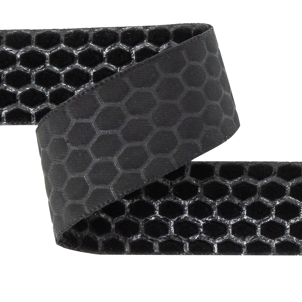 Make a comeback in black with this Italian Black Honeycomb Velvet Burnout Trim! At â…ž inches wide, this velvet ribbon is just sweet! The burnout pattern produces an arrangement of raised hexagons in a super soft pile with a one-directional nap.
