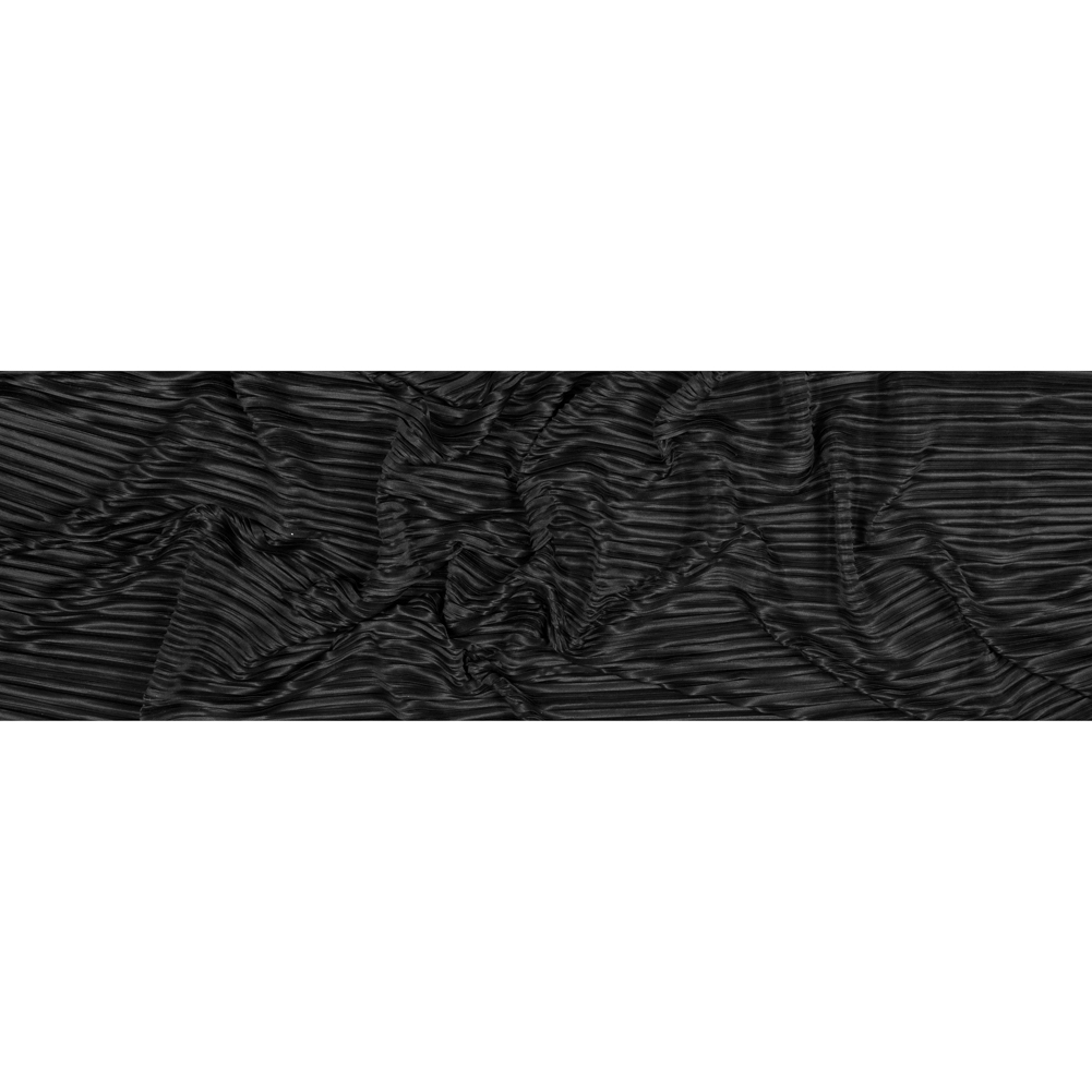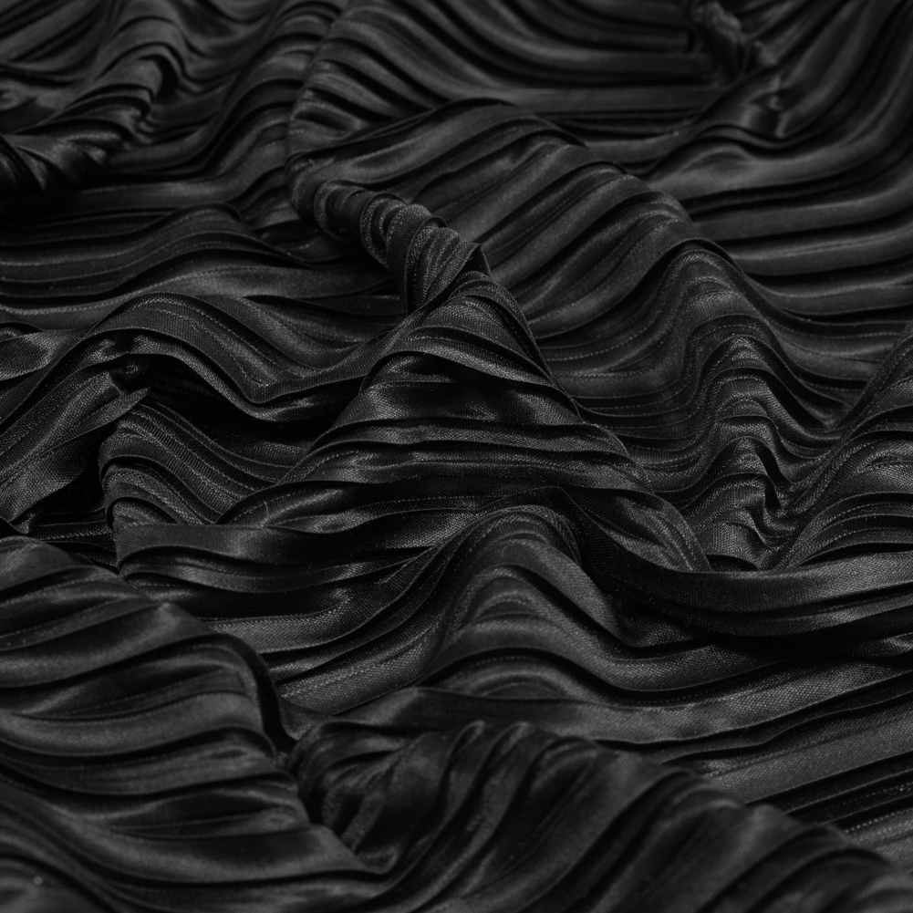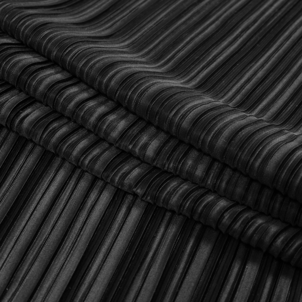 Draw the crowd in this forever chic Italian Black Pleated Polyester Woven. Mood presents a luminous Italian woven featuring one of this year's most sought after trends. A variety of pleats creates an unforgettable look of elegance. Take inspiration from the runway shows of Ferragamo and Issey Mayaki, and create one-of-a-kind blouses, skirts and cocktail dresses in classic or avant-garde designs. This fabric flows and moves for delightfully fluid silhouettes. It is thin and lightweight, so translate it into pieces for any season. Note that this woven is translucent and may require a lining in some applications.Please be aware that this pleated fabric is measured and cut with an open pleat.